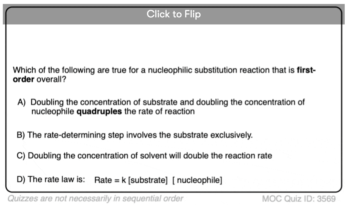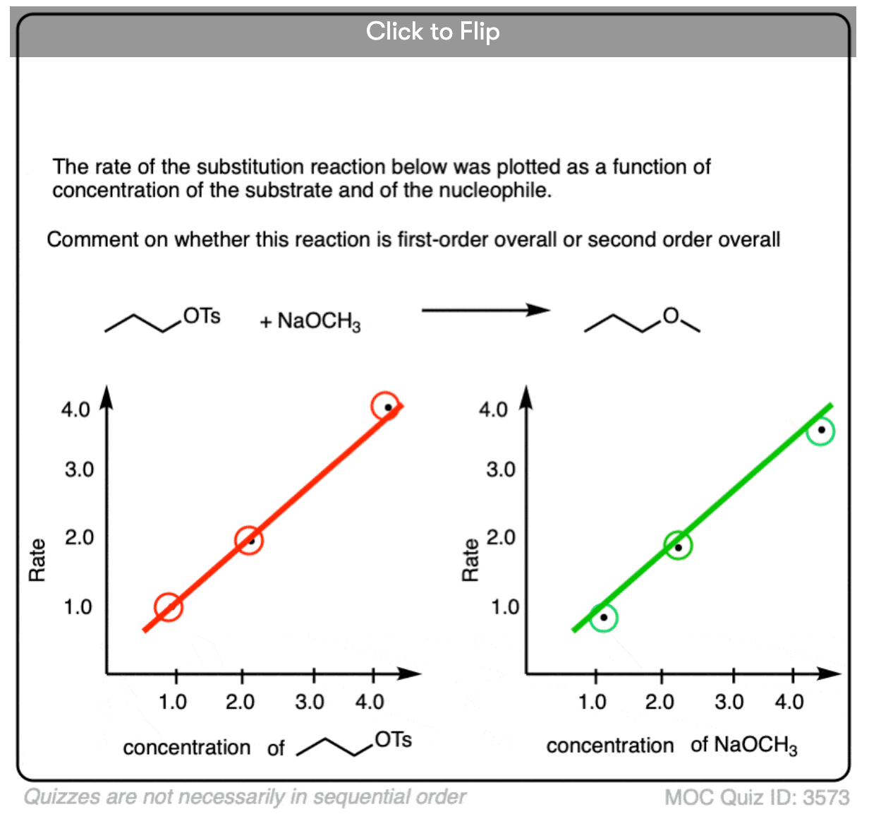 In the first reaction, the rate increases linearly as we increase the concentration of either substrate or nucleophile. That is, if we keep the concentration of substrate constant, and double the concentration of nucleophile, we will double the rate.