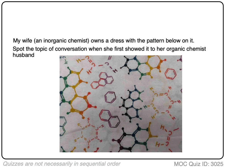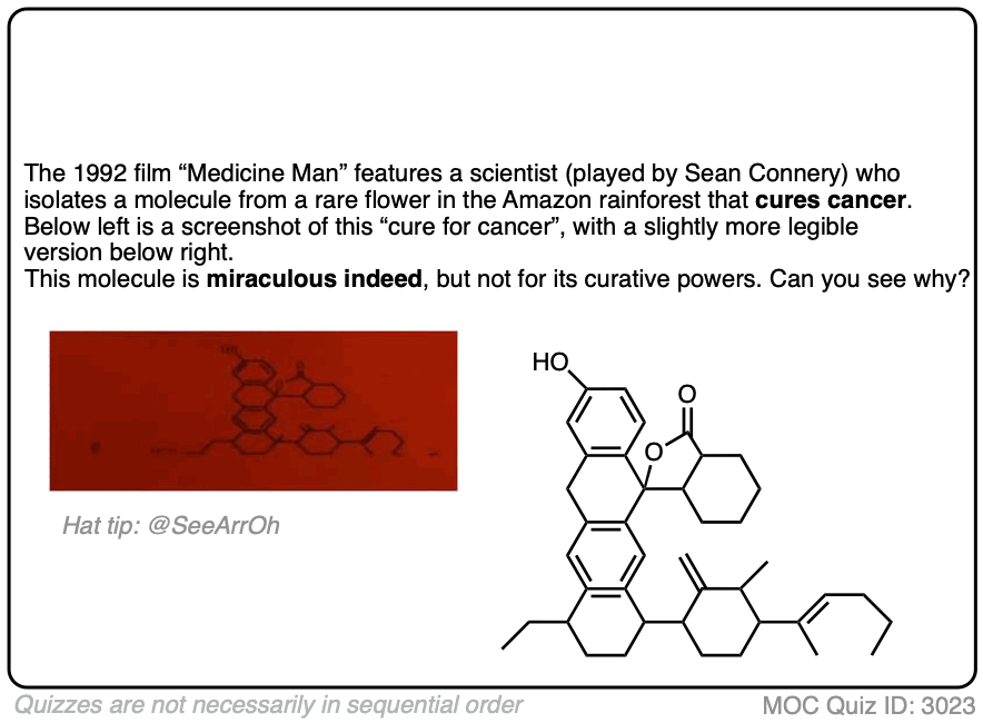 When Hollywood or a video game or even some graphic designer decides they need to draw a picture of a molecule, it seems like they just look at a few pictures of benzene online for inspiration and then start adding random extra bonds to improve the molecule’s “vibe”. This inevitably results in physically impossible molecular structures which, in addition to providing a source of amusement for organic chemists, are excellent quiz material.