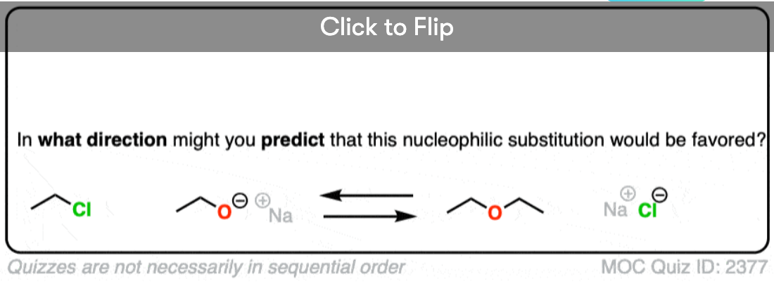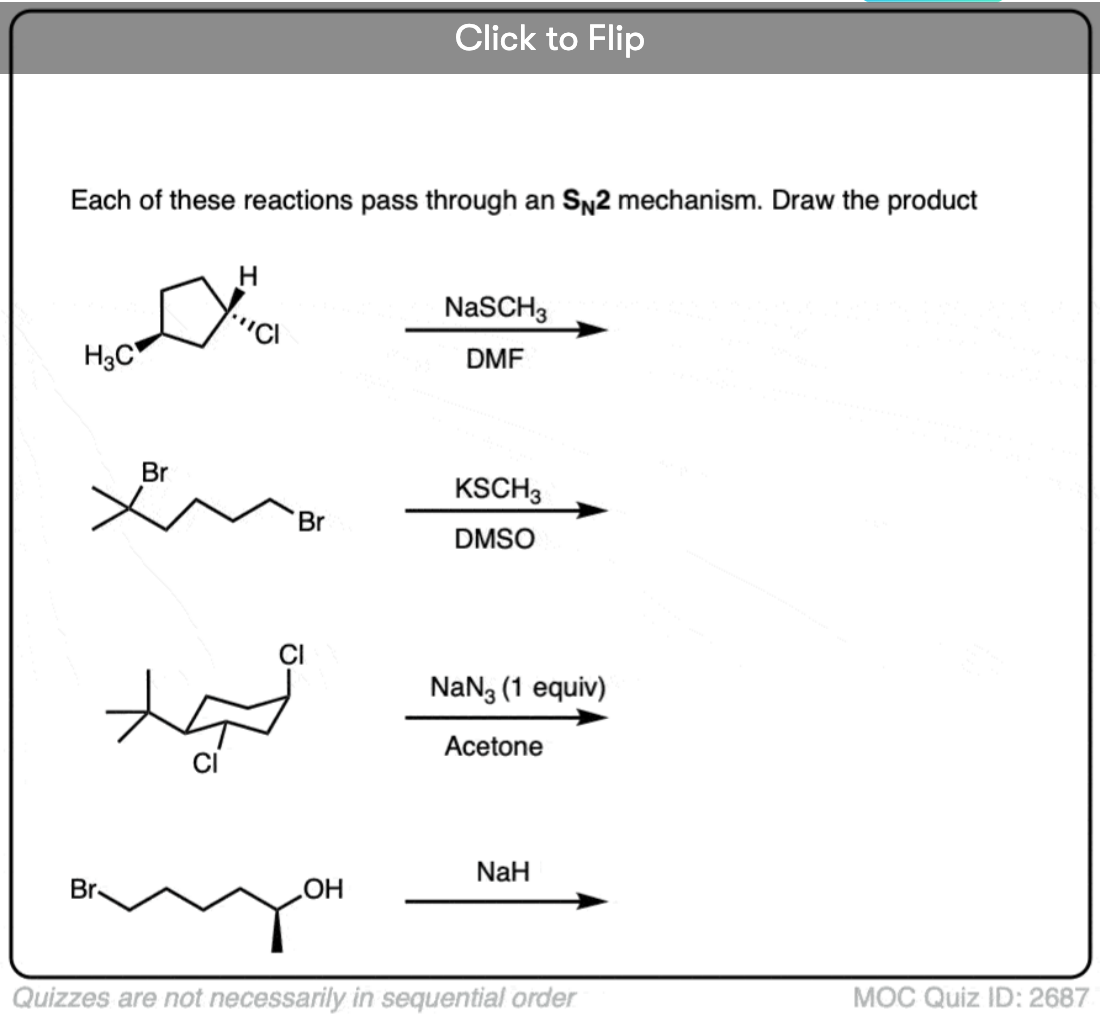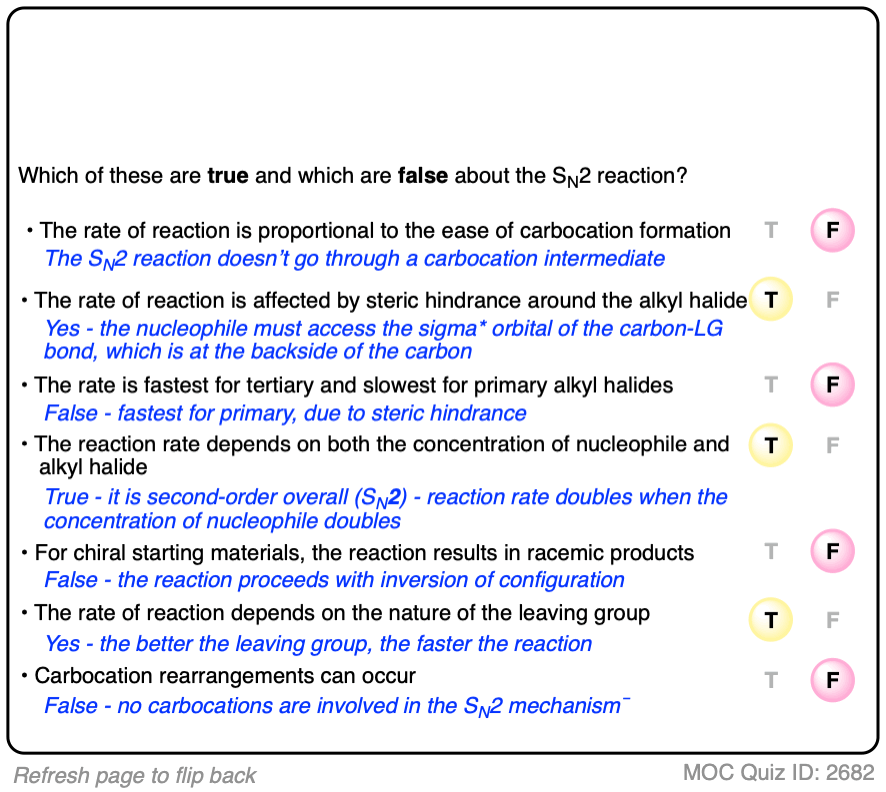 This paper describes a classic SN2 experiment on cis- and trans-4-t-butylcyclohexyltosylate. The trans ester reacts 19 times faster than cis because of the chair flip. Due to the t-butyl group, the barrier for ring inversion is extremely high (t-butyl is basically ‘locked’ in the equatorial position), and this is described further in the section on A-values. - Nucleophilic Substitution (SN2): Dependence on Nucleophile, Leaving Group, Central Atom, Substituents, and Solvent