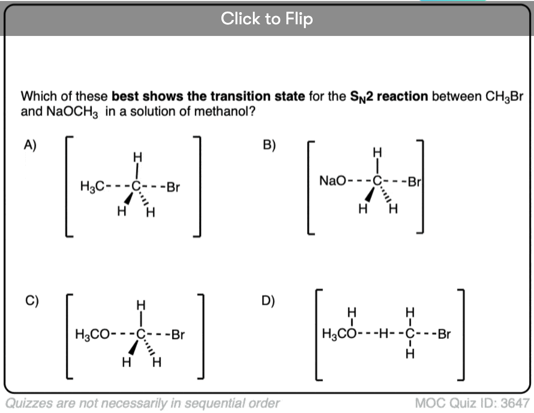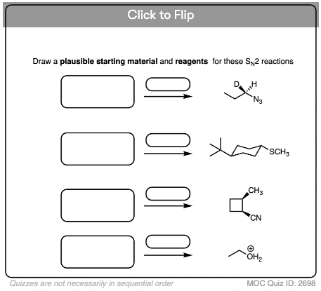 And in an analogy you’ll no doubt hear many times, then, like an umbrella in a strong wind, the three groups flip over as the leaving group leaves, resulting in inversion of configuration. Note that inversion happens at carbons without stereocenters too – it’s just that we can’t observe it because there’s no way to detect the change in configuration.