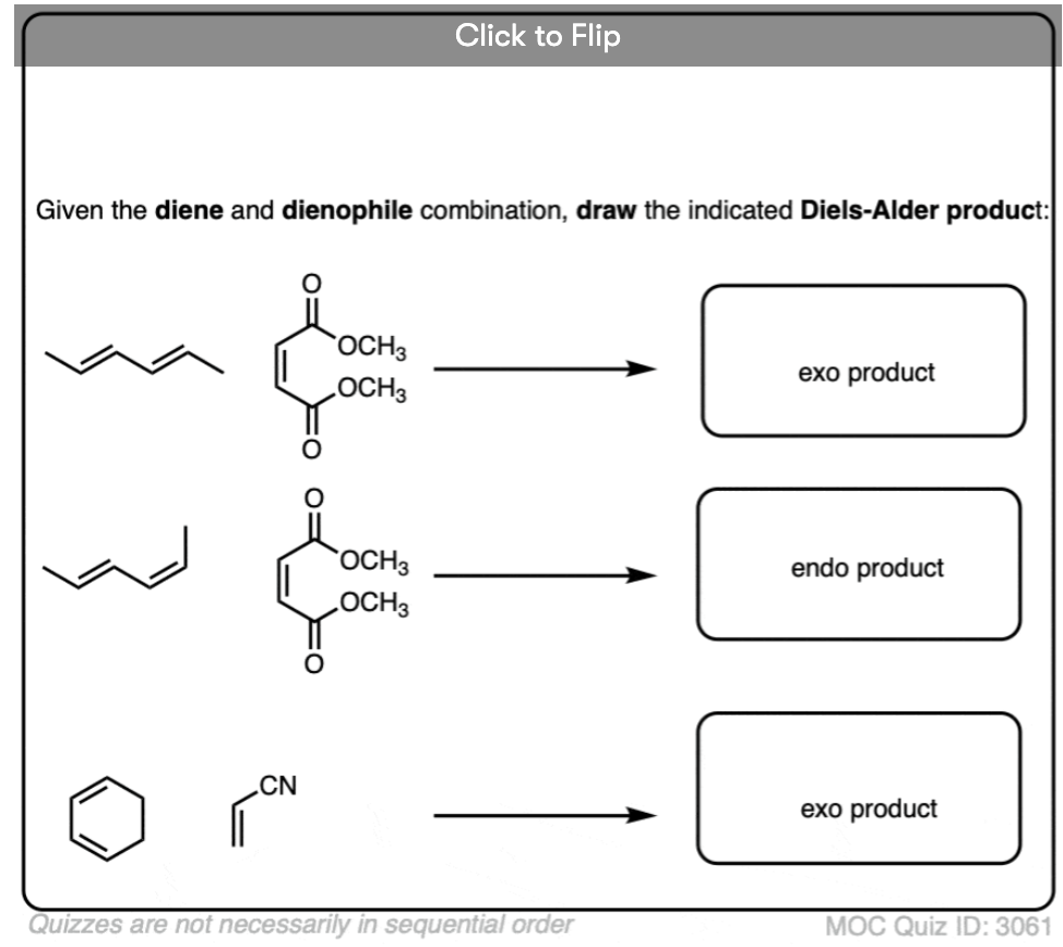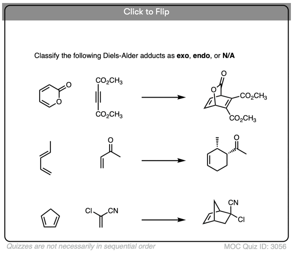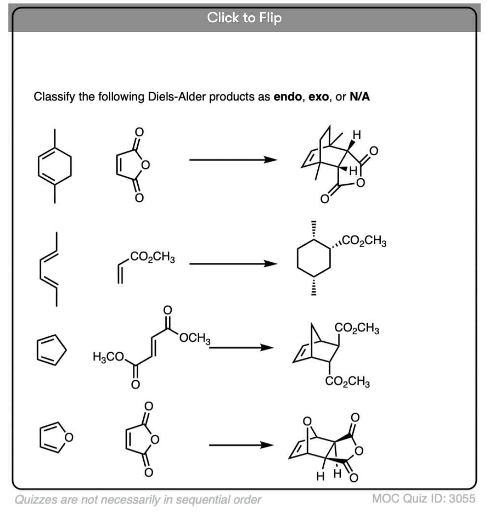 (These last two parts are from the last post, where we went through the stereochemistry of the Diels-Alder reaction.)