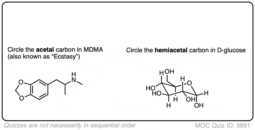 Wondering if you could post something explaining just how to look at one and tell if it is a hemiacetal or acetal. I understand that the hemi has an alcohol and an ether attached to the same carbon. But it would be nice to see each part of it labeled out and explained to us. Thanks this infor was amazing!