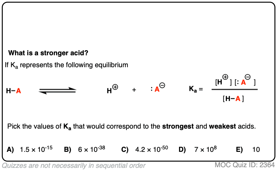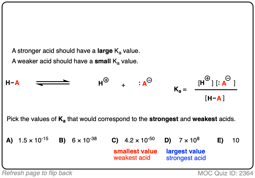- A strong acid has complete or nearly complete dissociation, so a large Ka.