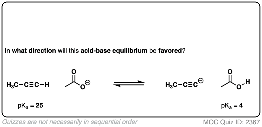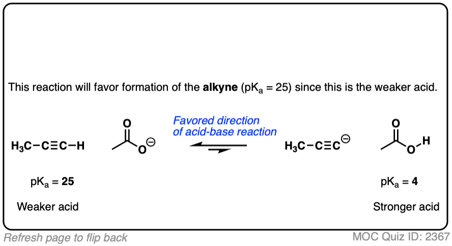 Let’s start with an acid base reaction involving a terminal alkyne (pKa 25) and acetic acid (pKa 4)
