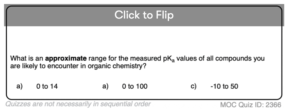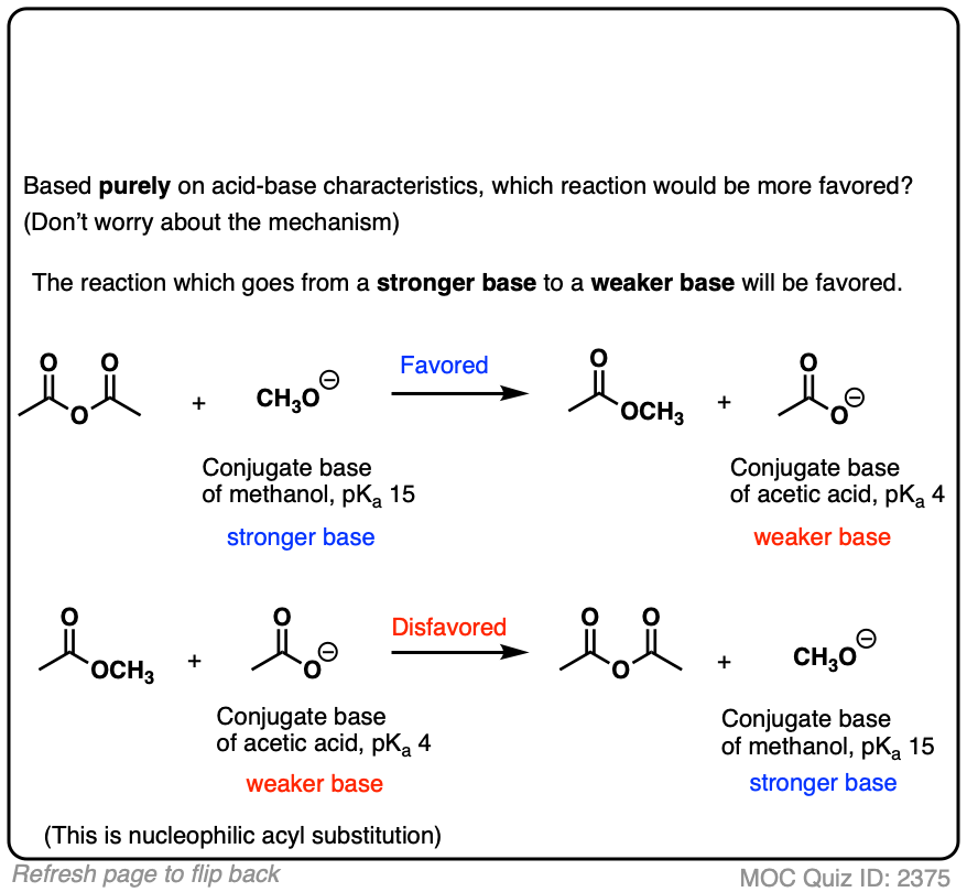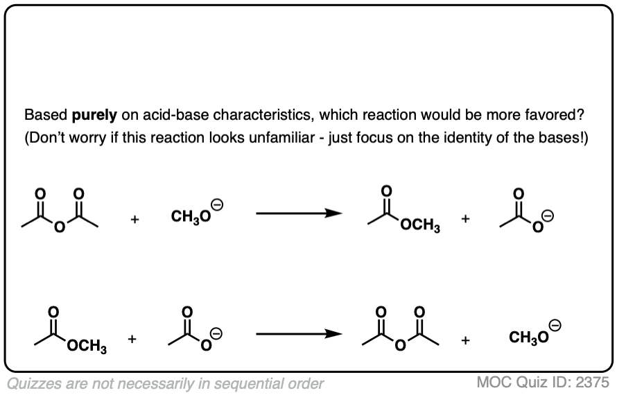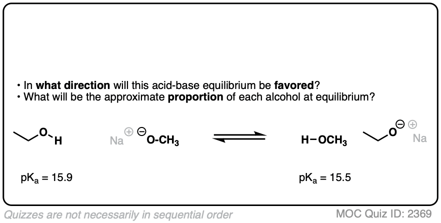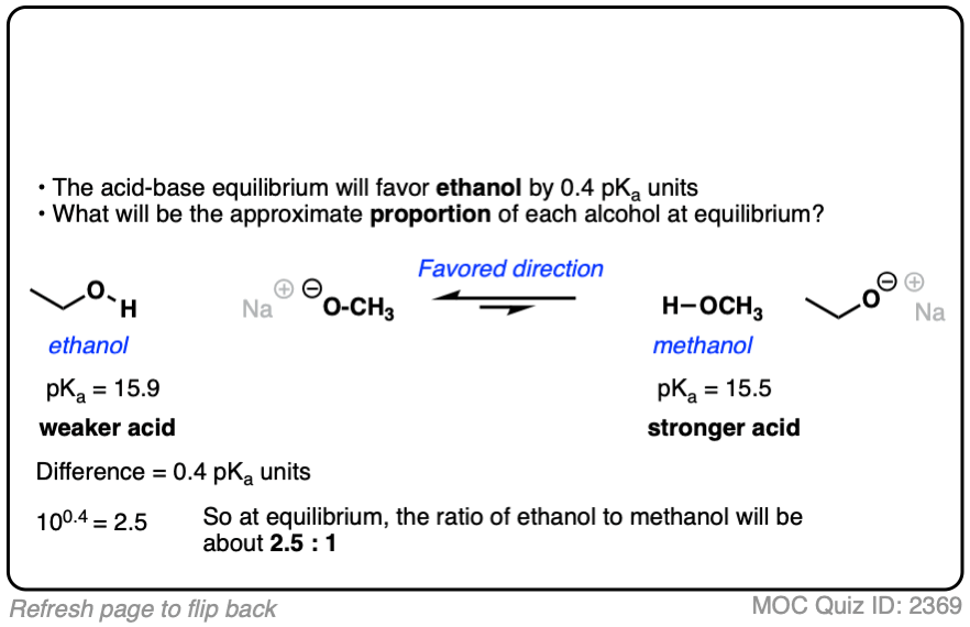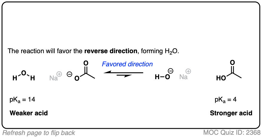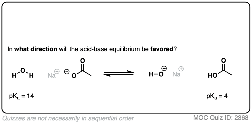 So the acid-base reaction in the quiz above favors water (pKa 14) by about 10 orders of magnitude (1010) over acetic acid (pKa 4). That means there are roughly 10 billion molecules of water for every molecule of acetic acid.