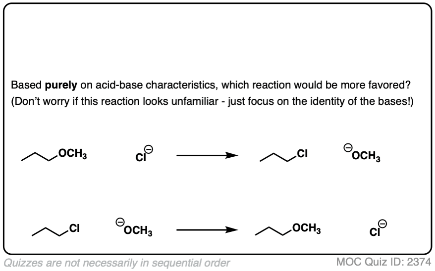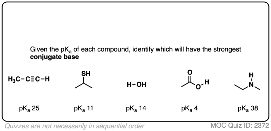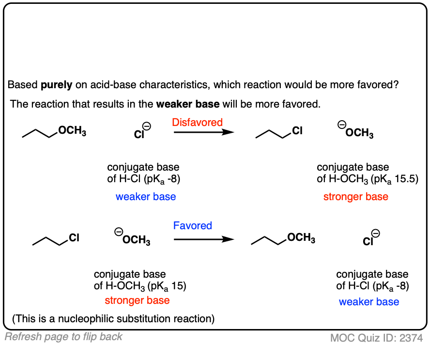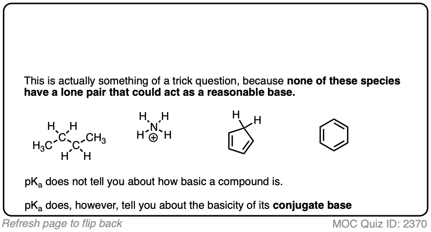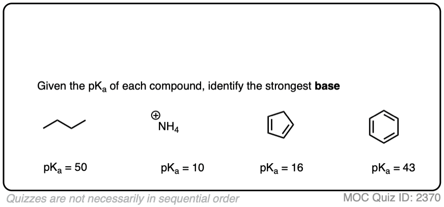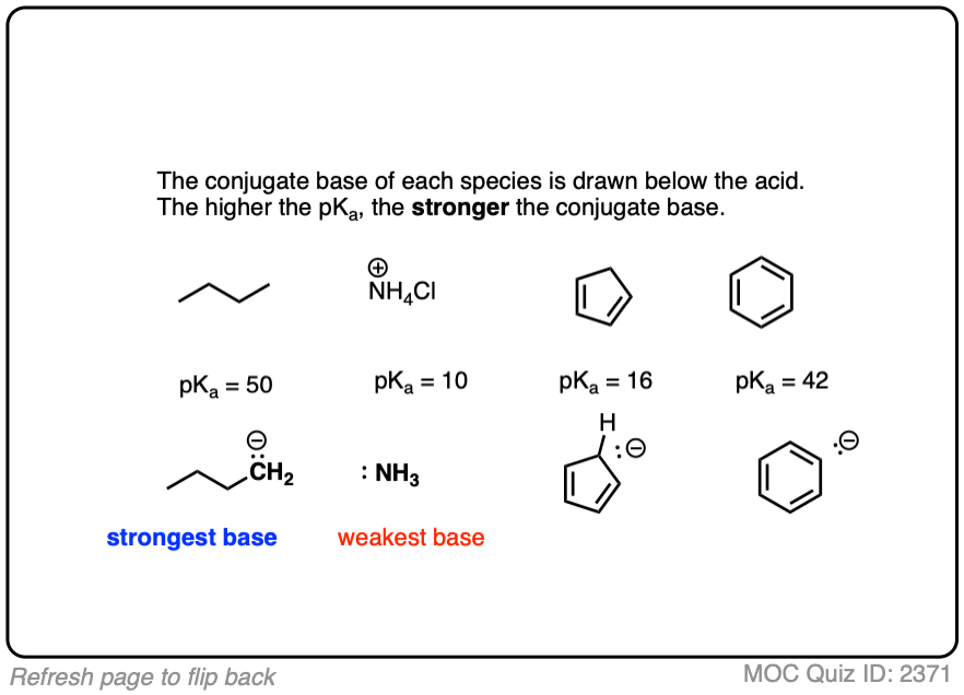 For example, just like a royal flush beats all other hands in poker, a deprotonated alkane like CH3(-) will have a favorable acid-base equilibrium for the deprotonation of anything below it in the pKa table.
