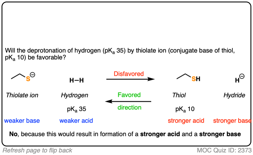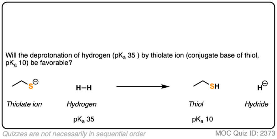 To figure this out, we draw out the four components of our acid base reaction. We then look on our pKa table for the pKa of a thiol and H2 . The pKa of the thiol is about 10 and the pKa of H2 is about 35.