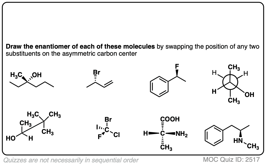 - For a chiral molecule with only one chiral center, a single swap on that chiral center will convert it into its enantiomer
