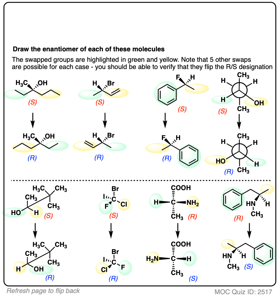 Our starting molecule has the (R) configuration. Flipping any two groups (e.g. blue and red) gives the enantiomer, which has the (S) configuration.
