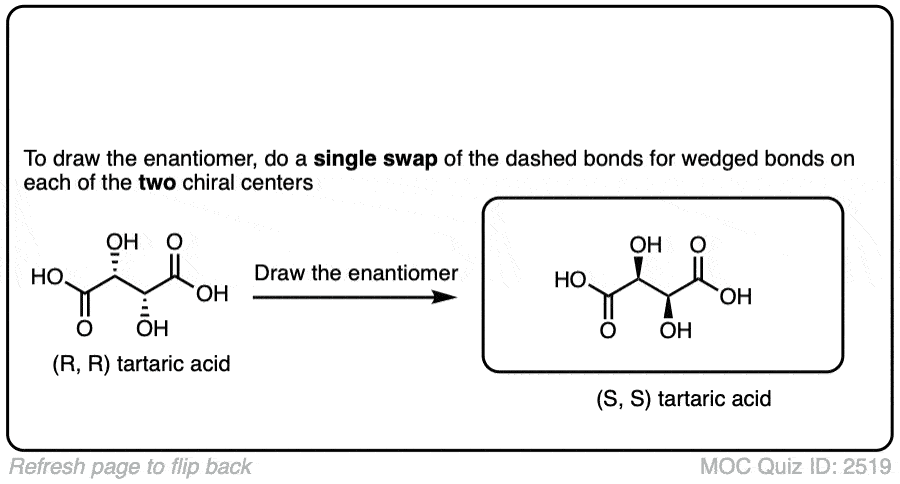- To draw the enantiomer of a chiral molecule, 1) identify all the chiral centers and 2) do a single swap on each chiral center (Note – it’s equivalent to just convert all wedged bonds to dashed bonds and vice versa)