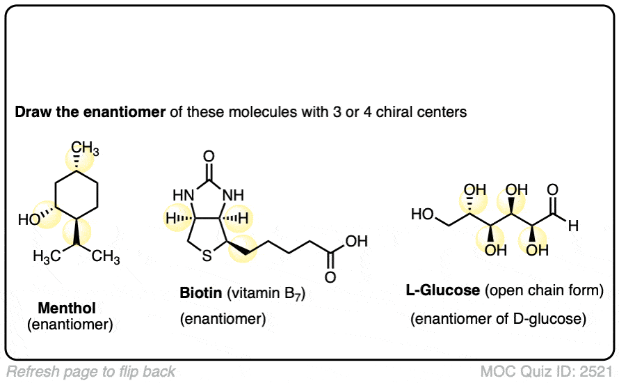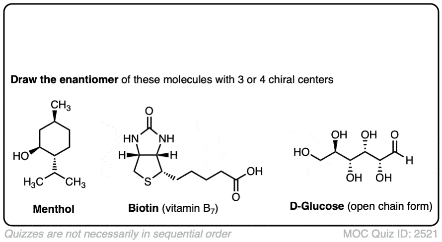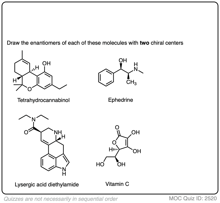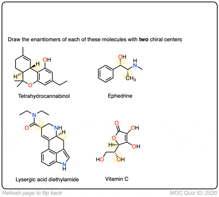 Now that you’ve done that, draw the enantiomers of these molecules each with two chiral centers (some of which you may have heard of).
