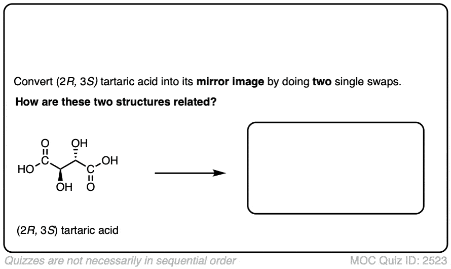 Convert (2R, 3S) tartaric acid to its mirror image by doing two single swaps.