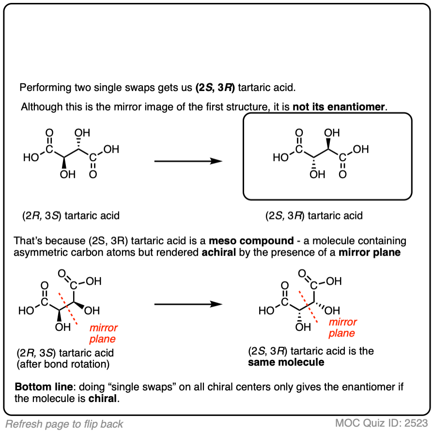 So the “single swap rule” has a catch. Flipping all the chiral centers will only result in the enantiomer if the compound is chiral.