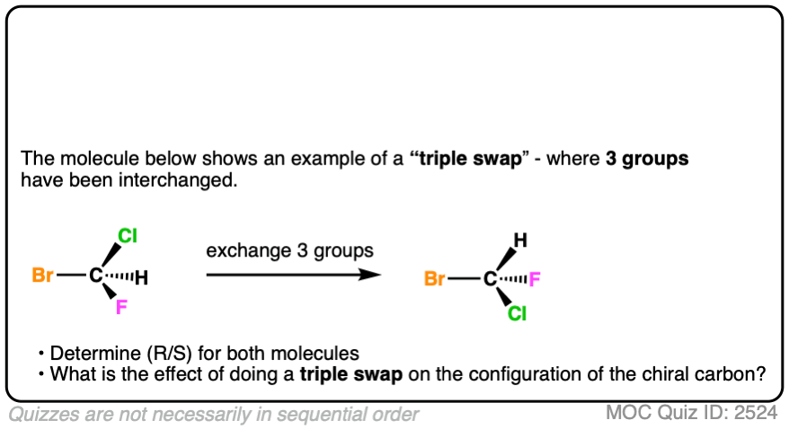[Note that in this example we are only exchanging the groups and otherwise leaving the bonds alone – much like what one would do when plucking atoms off a model kit and reattaching in a different order. There’s a second way to do a single swap where the groups are left alone and the dashed/wedged bonds are swapped that we will discuss shortly]