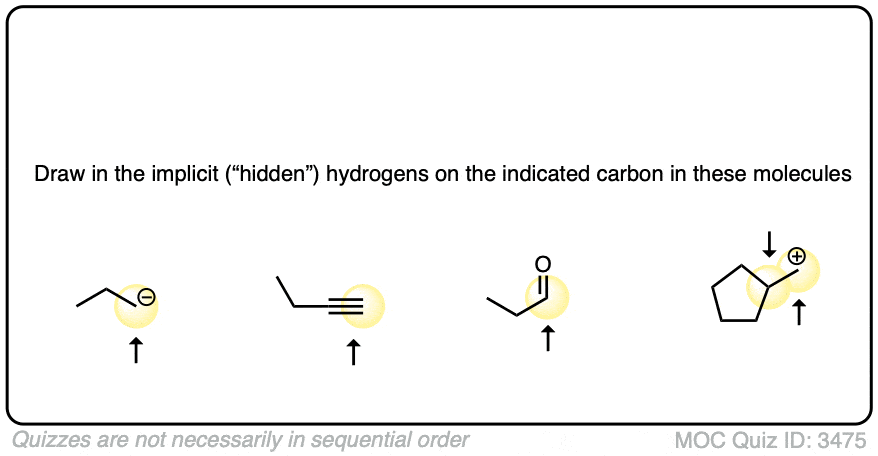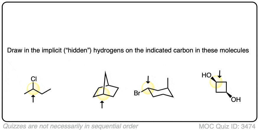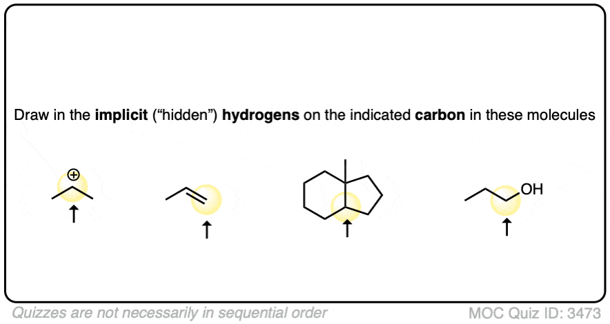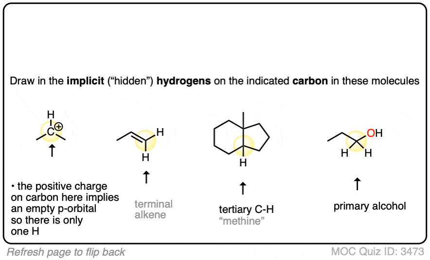 The key thing in recognizing hidden hydrogens is that wherever you see less than 4 bonds to carbon, that carbon is going to have hydrogens attached such that there’s a full octet. Here are some examples.