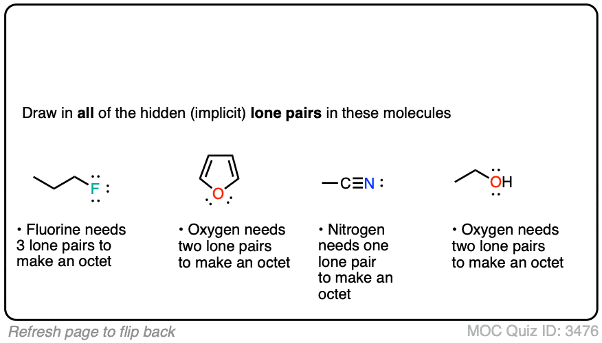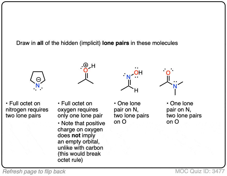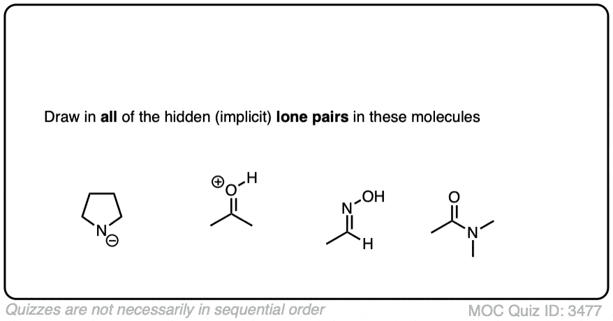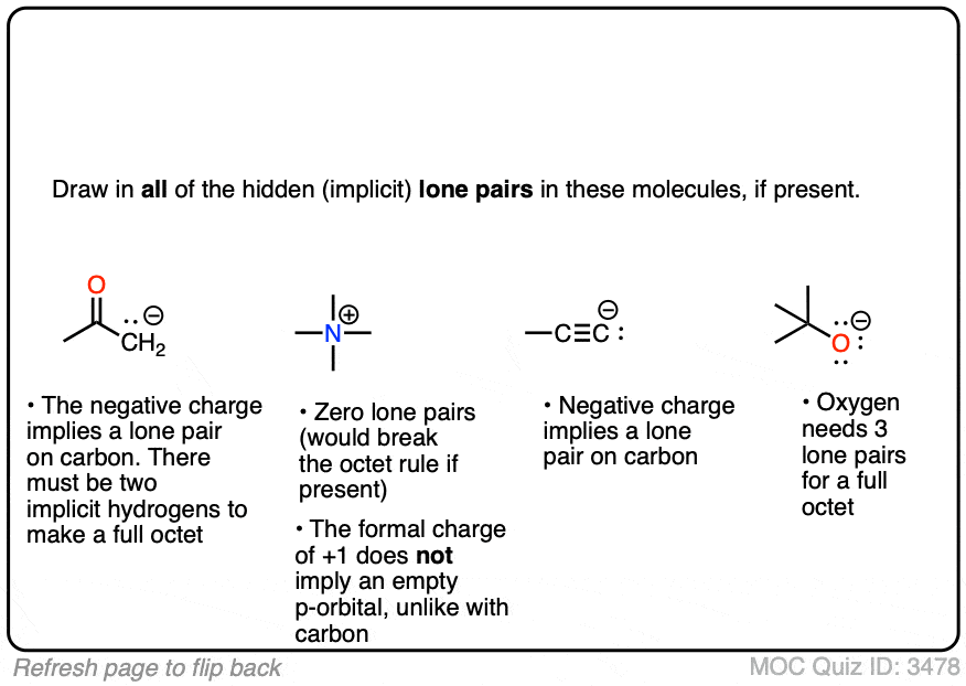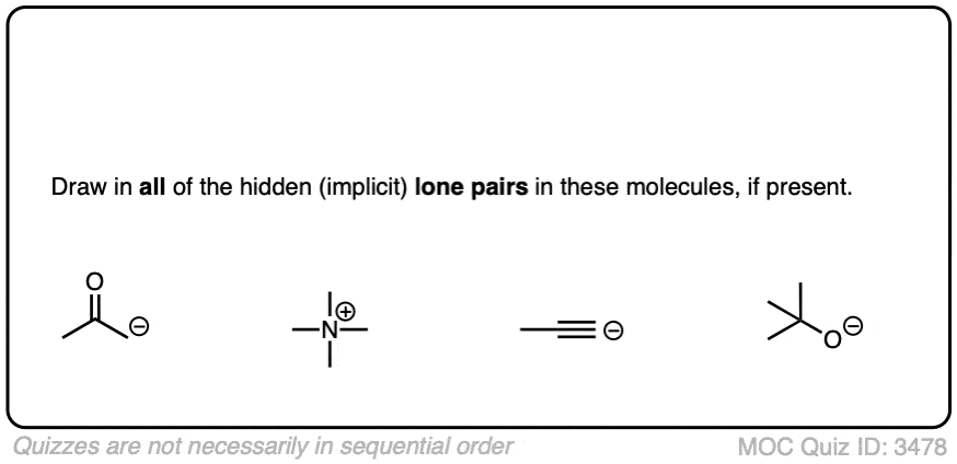 This also comes up in reactions. Using the curved arrow notation, you’ll often see the tail of an arrow coming from a negative charge on a given atom. You’re just supposed to know that the negative charge represents a pair of electrons on the atom.