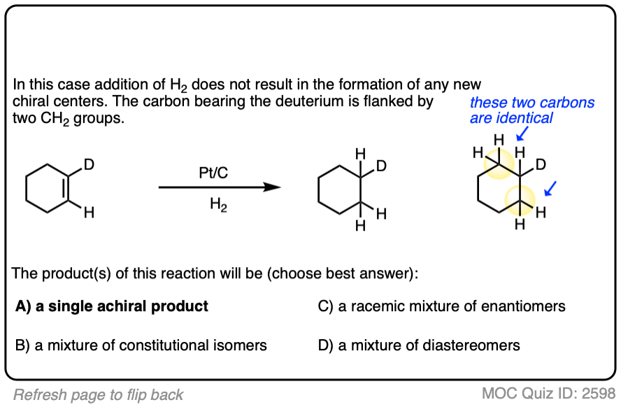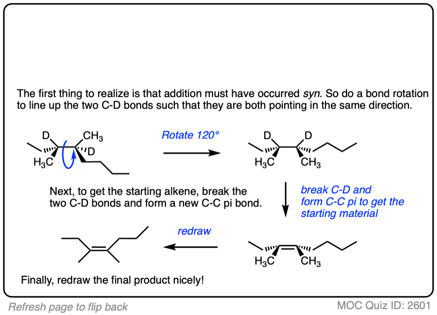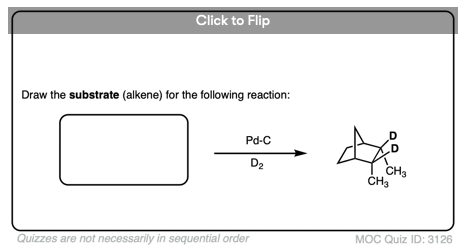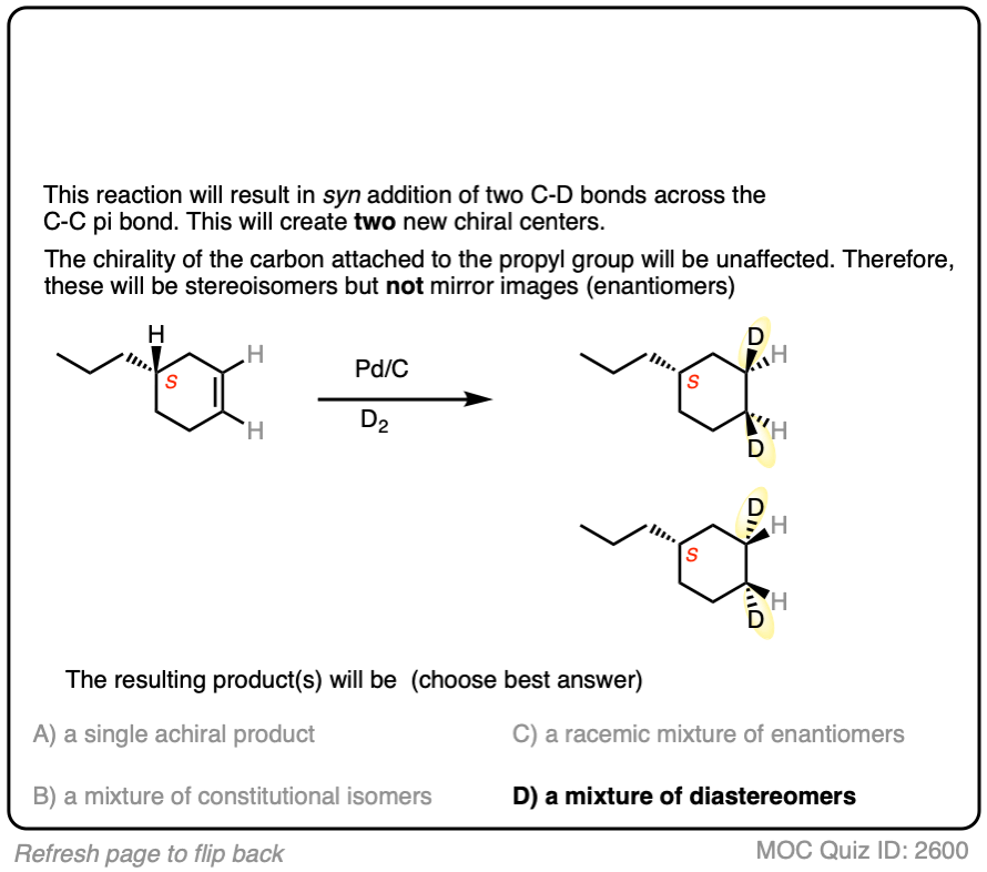 Deuterium (D2) can be used in place of hydrogen to give isotopically labelled products (recall that deuterium is the heavy isotope of hydrogen). The reaction is otherwise identical in all respects, including a preference for syn addition.