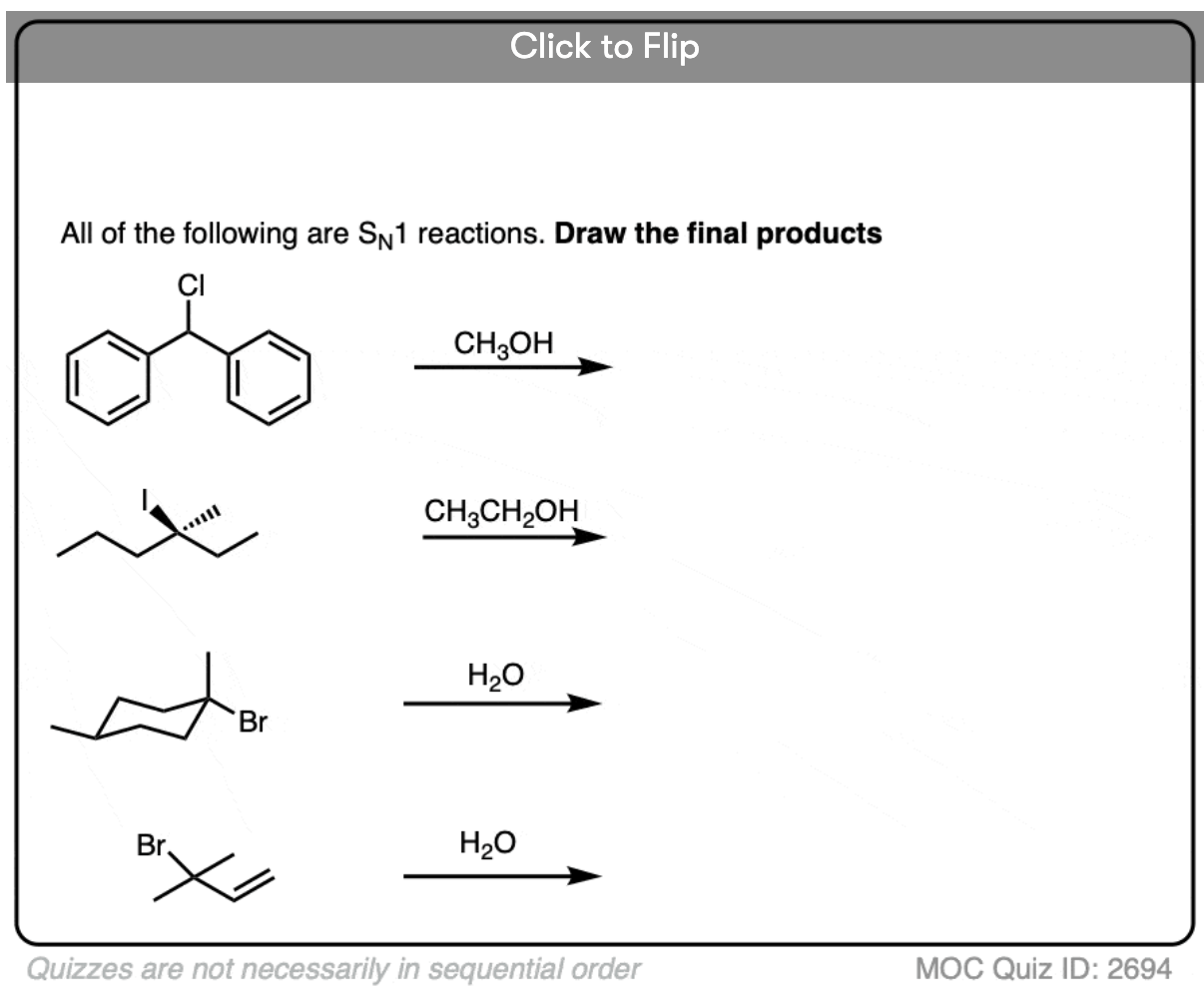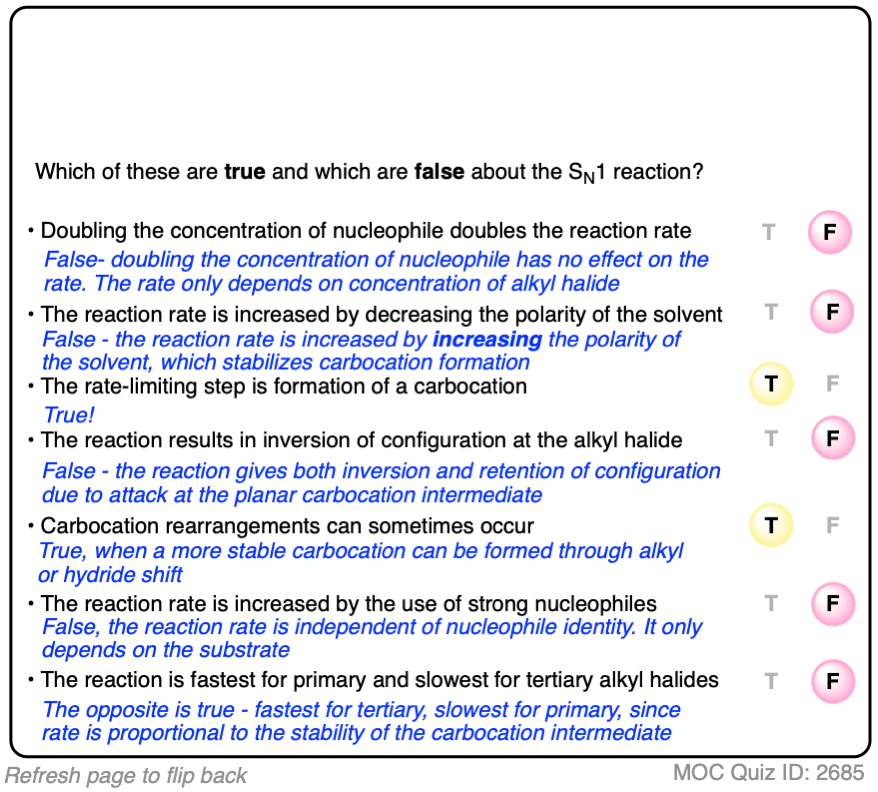 Note 2. Athough it’s often said that the SN1 proceeds with “racemization” of stereocenters, in practice a 50/50 split of stereocenters may not be obtained due to “ion pairing” effects.