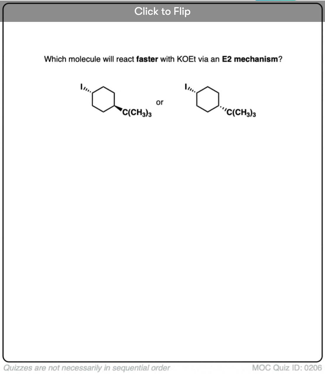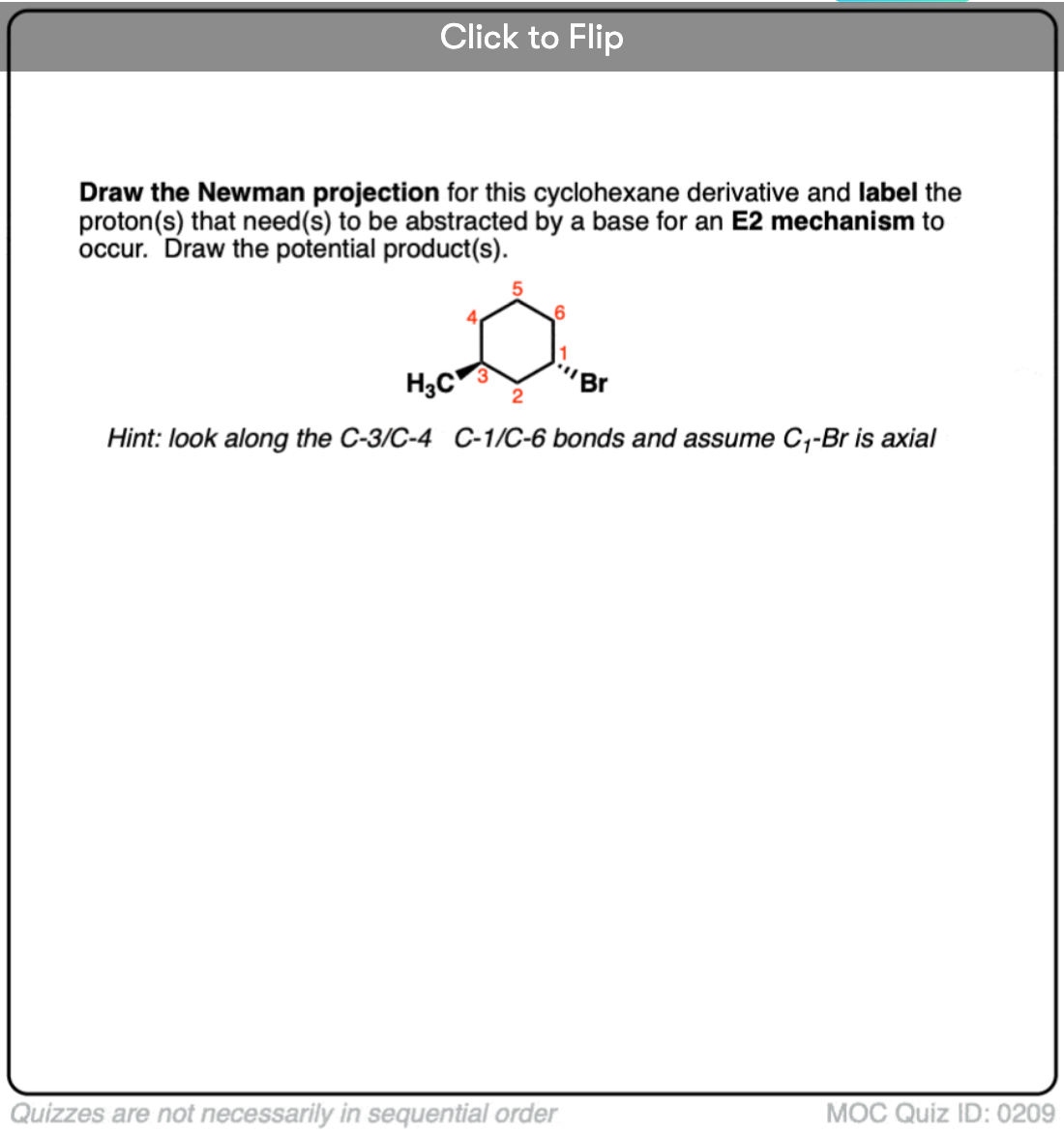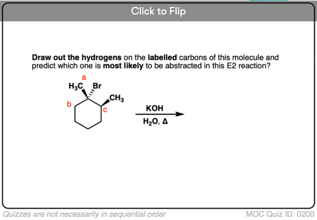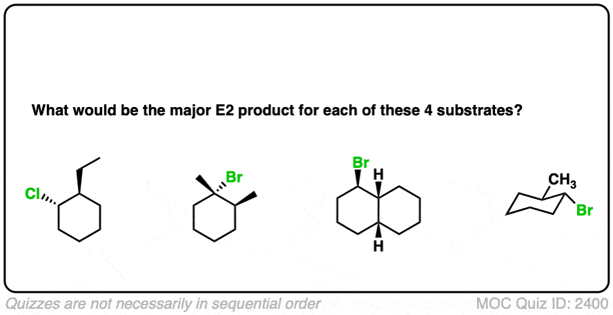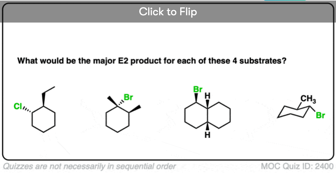 Hey!Got stuck in a point,you say that the Br needs to be axial in order to go through E2,but crap in the 4th question of your quiz the methyl cyclohexane without any axial Br does goes through E2.I understand that it works out because of being anti-periplanar,but please,I think it will be best to be less specific about the Br being axial in some parts of the Reply is highly appreciated.