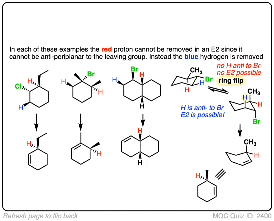 So if you draw the leaving group equatorial in a cyclohexane chair, you’ll have to do a chair flip so that the leaving group is axial. That’s shown in the right hand example, where an E2 can actually happen.
