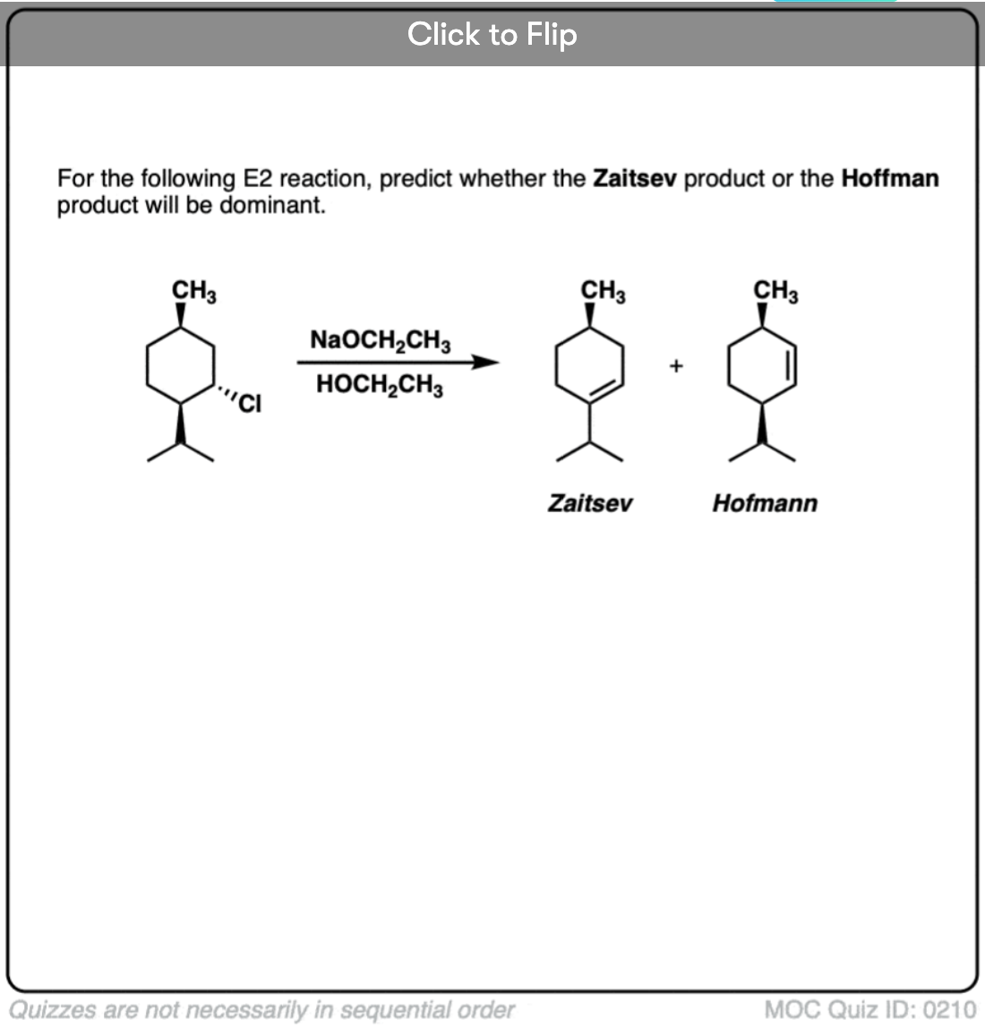 This paper illustrates Zaitsev’s rule in a cyclohexane system. Neomenthyl chloride gives 78% 3-menthene and 22% 2-menthene with EtO– in ethanol . - Mechanism of elimination reactions. Part XXII. Anomalous elimination from the trimethylneomenthylammonium ion