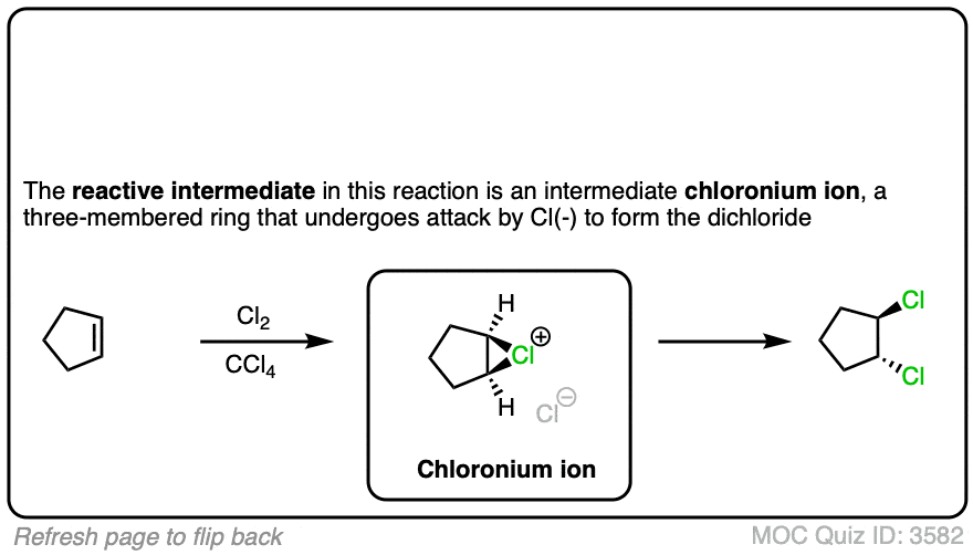 Note 1. “Inert solvent” here just means a solvent that won’t react with the halonium ion intermediate. CCl4 and CH2Cl2 leave halonium ions alone; H2O, alcohols, and carboxylic acids can potentially undergo reactions with them.