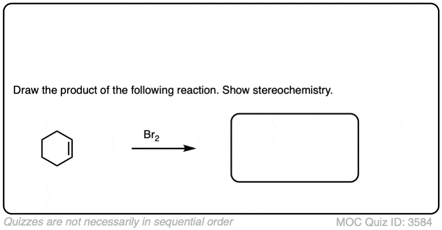 The stereochemistry of this reaction is very frequently tested. Make sure you can properly draw the products of anti addition and additionally, can work backwards from the dihalide products to the alkene starting materials.