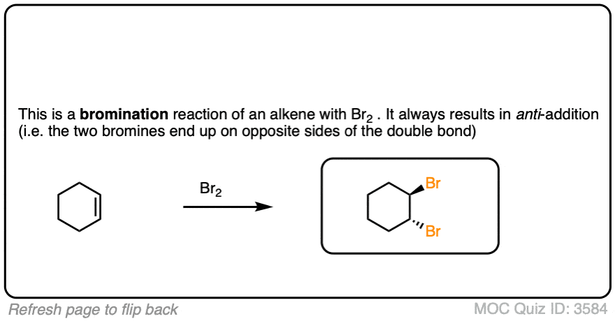 [Note that, like a flat coin that can land on “heads” or “tails” with equal likelihood, the bromine can “land” on either face of the alkene – this will give rise to enantiomers in this case].