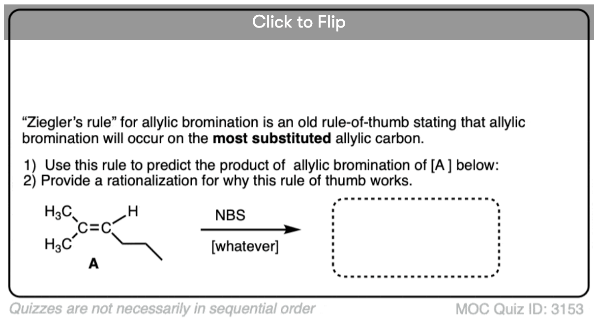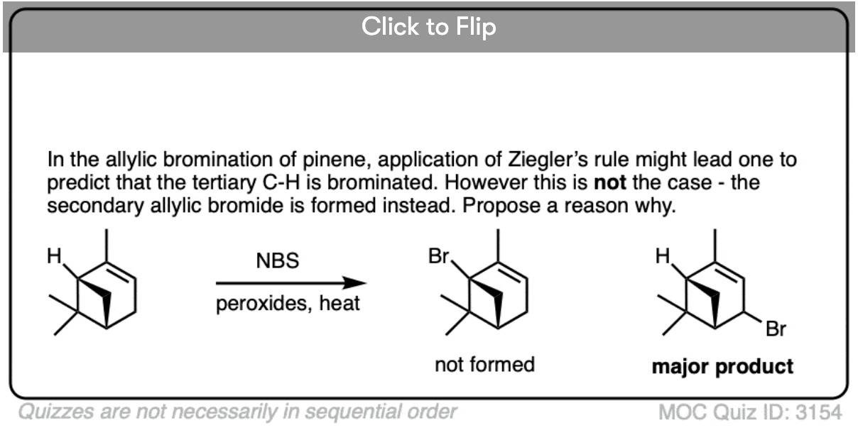 However in the case of allylic bromination, that reaction is (ideally) a cul-de-sac. Once Br• radical addds to the double bond, forming that carbon-based radical, there is (ideally) nothing for it to react with since we’re not adding HBr and we’re keeping the concentration of Br2 low. Therefore the addition will revert back to the double bond and Br radical, and eventually the Br• will abstract a hydrogen from the allylic position.