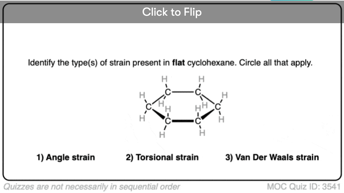 The key difference is that the molecules don’t necessarily have to be flat! In fact, as we saw for cyclobutane, “flatness” is disfavored, because it leads to eclipsed C-C bonds, which can have considerable torsional stain. In fact we saw that the dominant conformation for cyclobutane was the “puckered” conformation, where one of the carbons pokes out of the plane created by the other 3 carbons. This relieves torsional strain.