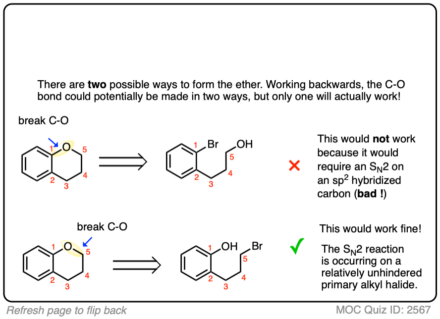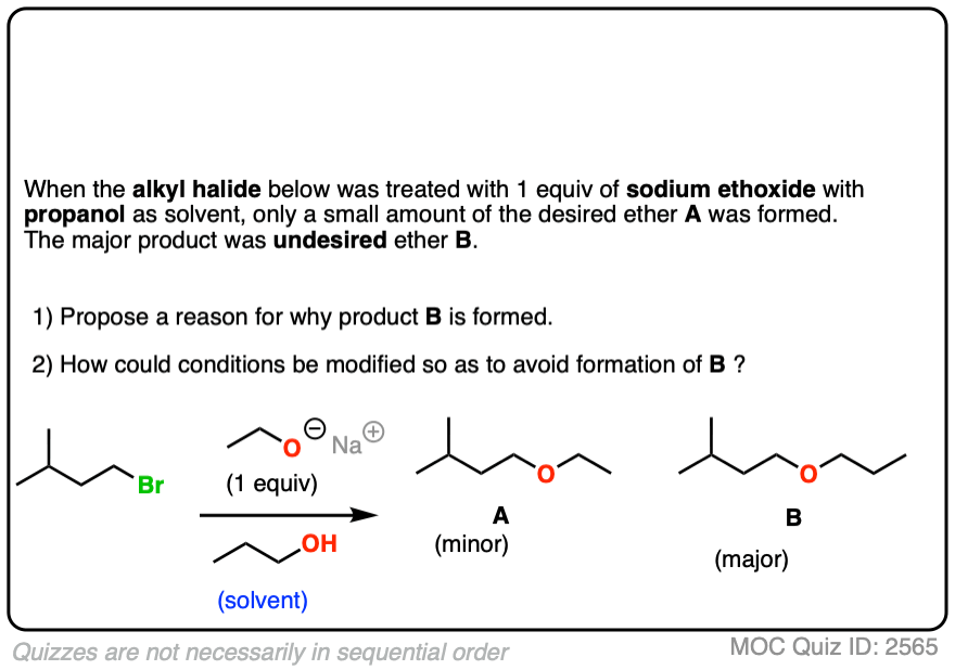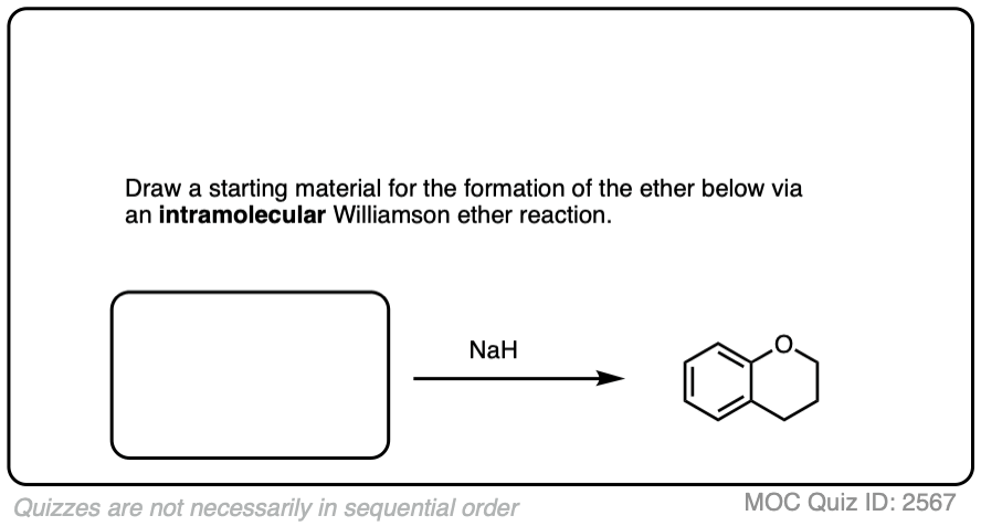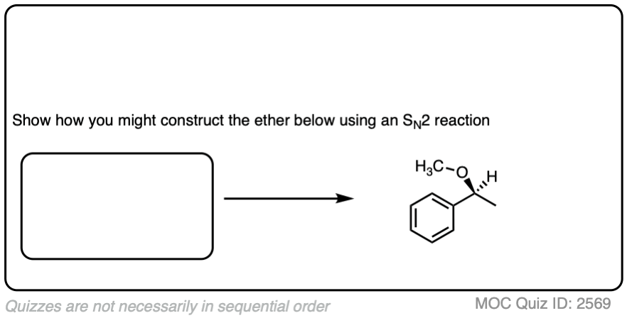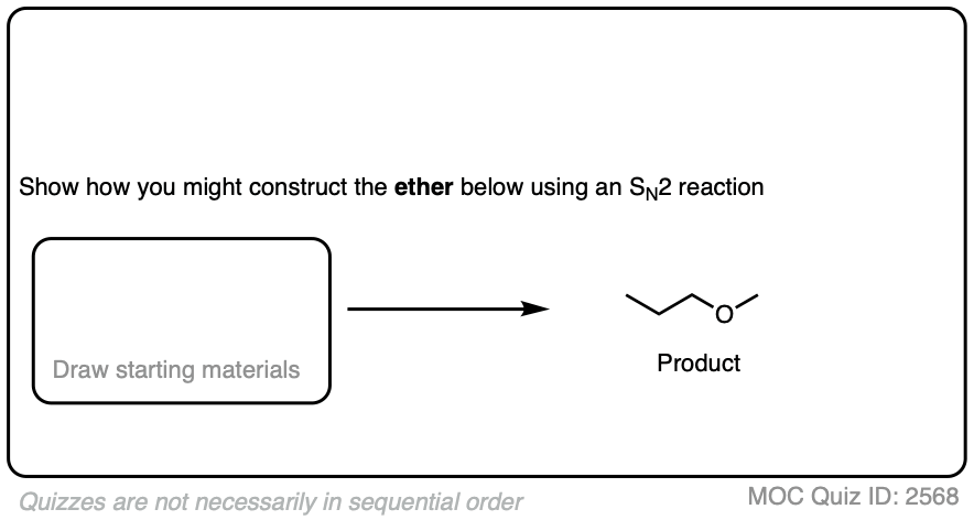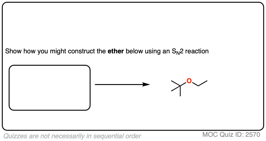 It’s also valuable to be able to work backwards from a final product to propose plausible starting materials. See if you can draw a feasible starting material that will result in the Williamson product below: