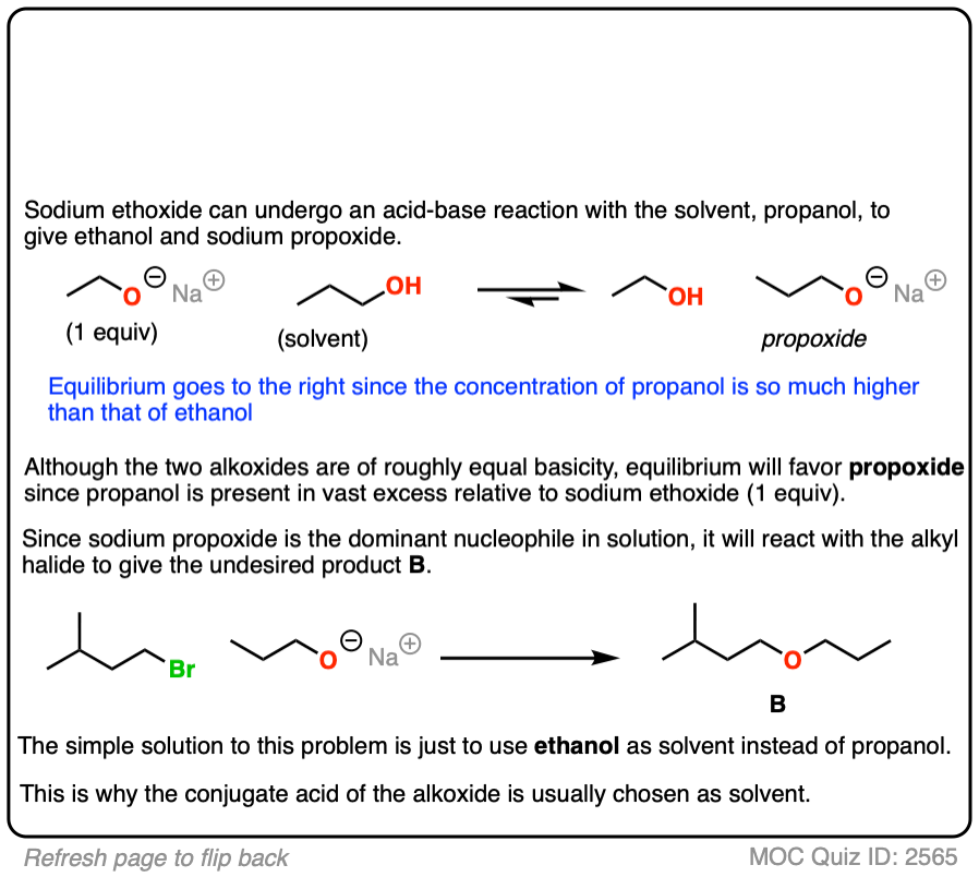 Since it’s not always an option to use the alcohol as solvent, another option is to generate the alkoxide by using a strong base that will irreversibly deprotonate the alcohol.