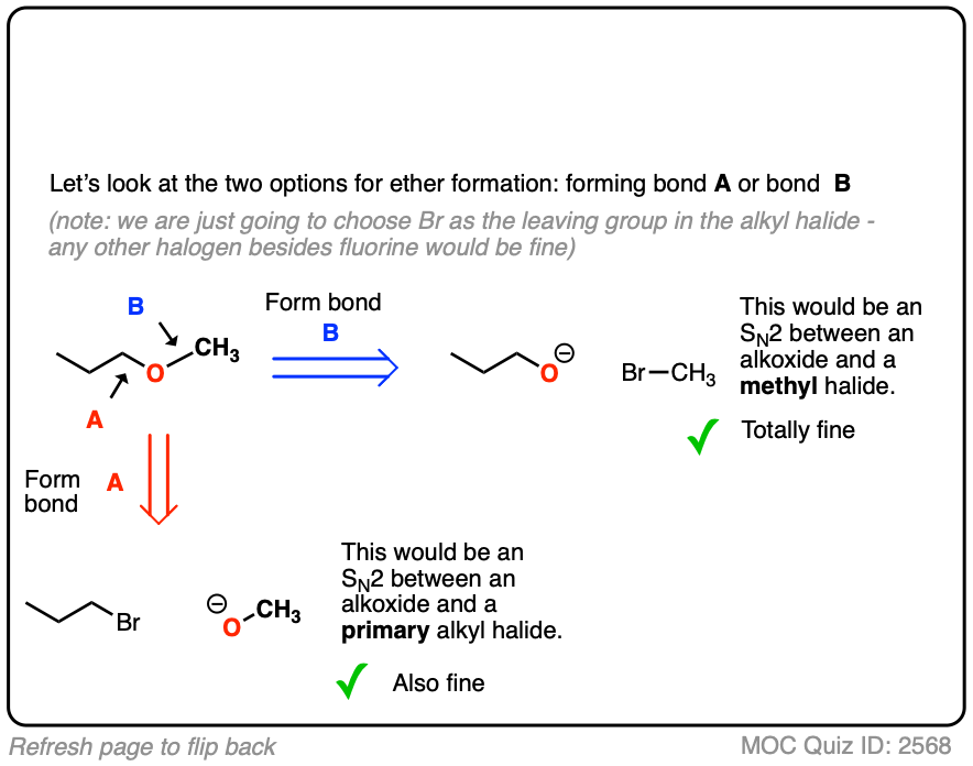 Let’s start with a fairly easy example. See if you can come up with reasonable starting materials for the synthesis of propyl methyl ether via the Williamson reaction.