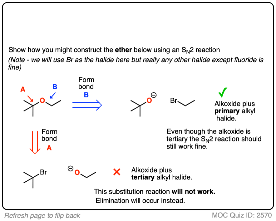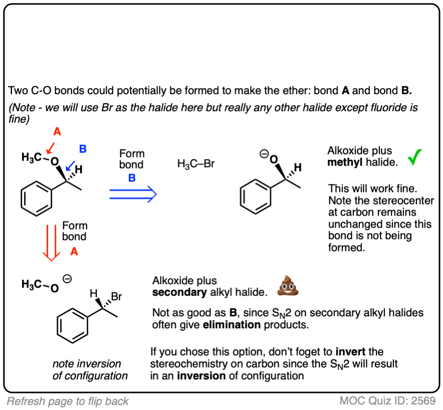 A worse choice would be a secondary alkyl halide with methoxide. Note that since this is an SN2 – which proceeds with inversion of configuration – and the secondary alkyl halide chiral, the starting alkyl halide will have the opposite configuration to that of the starting material.