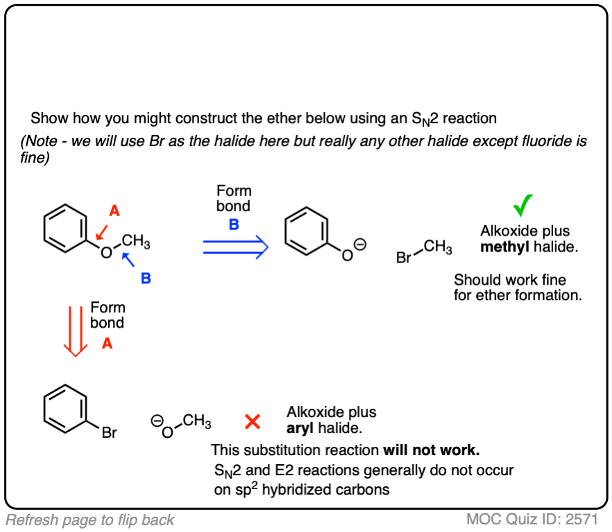 Since SN2 and E2 reactions generally do not occur with sp2 hybridized carbons, another case where Williamson reactions fail is with aryl and alkenyl halides.