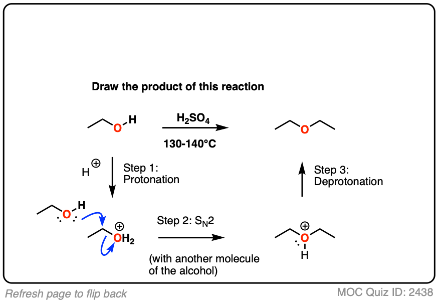 - The reaction proceeds through protonation of a hydroxyl group to give the conjugate acid followed by an SN2 reaction to give the symmetrical ether.