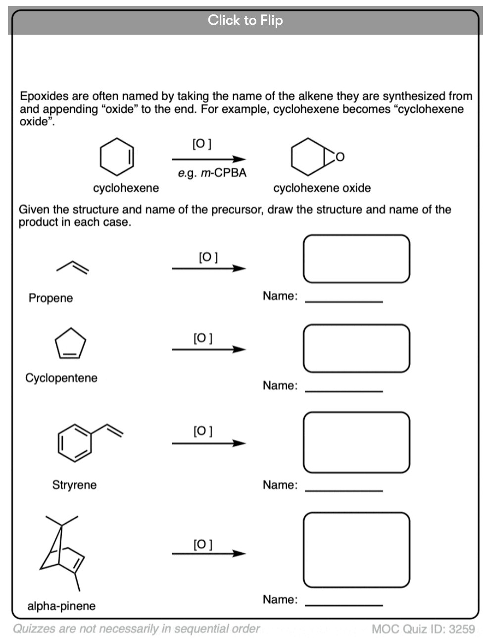“Treating an alkene with a “peroxyacid” (that’s a carboxylic acid containing an extra oxygen) leads to direct formation of an epoxide.”