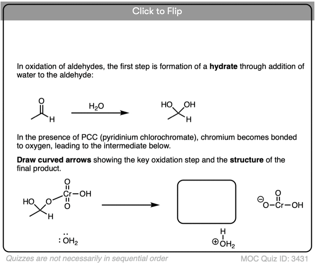 NOW, the oxidant attaches to one of the hydroxyl groups of the hydrate. The E2 from here is much easier to visualize.