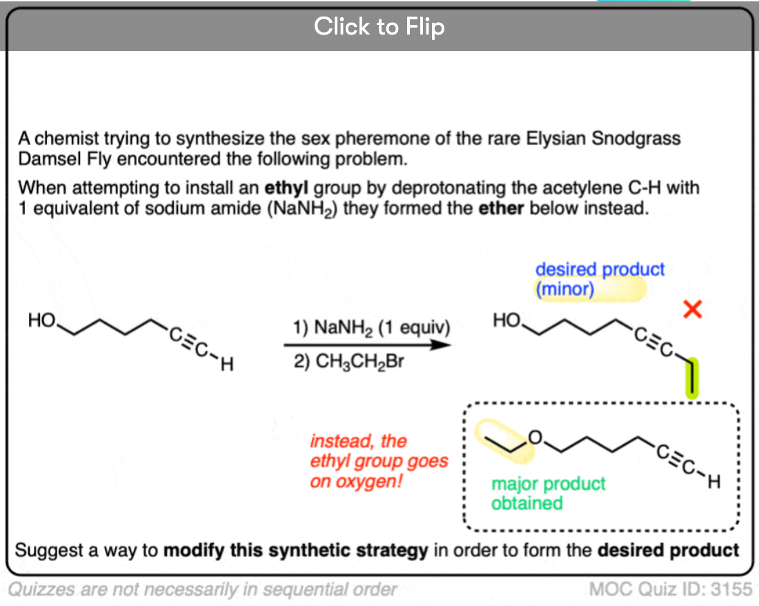 Note 1. Isn’t it possible that NaNH2 could have deprotonated a little bit of the alkyne? Sure! But remember that acid base reactions are equilibrium, and the alcohol is a far stronger acid (pKa ~16 ) than the alkyne (pka 25). Even if that acetylide formed, it would be quickly protonated by any spare alcohol R-OH swimming around, giving rise to the alkoxide. [back to article]