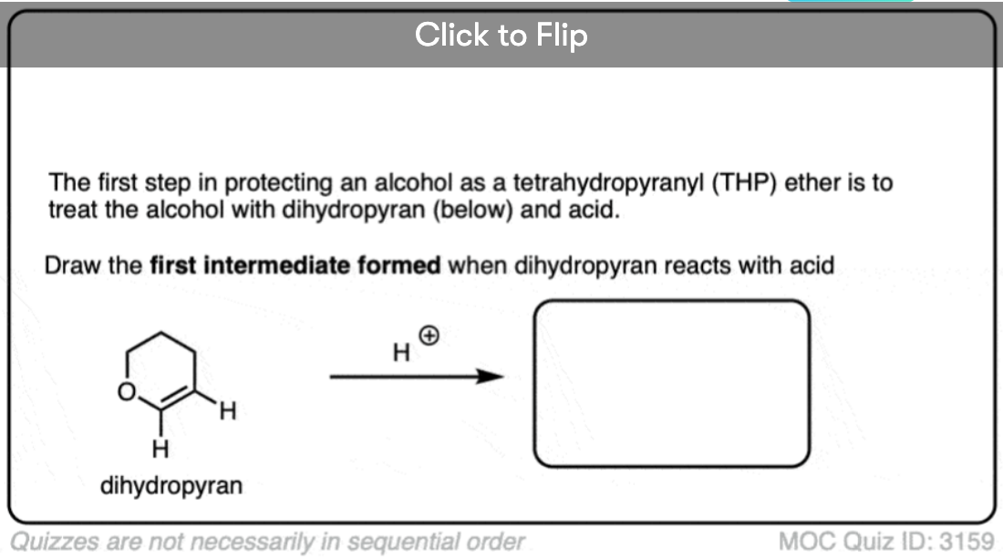 THP ethers are slightly different. They are installed by adding dihydropyran (an “enol ether”) in the presence of strong acid. The enol ether is protonated at carbon by the strong acid, resulting in an oxonium ion, which is then attacked by the alcohol to give the ether. This is actually a special type of ether where two OR groups are attached to the same carbon. It’s a masked ketone, which we refer to as an acetal. We talk about acetals here in this blog post. [back to article]