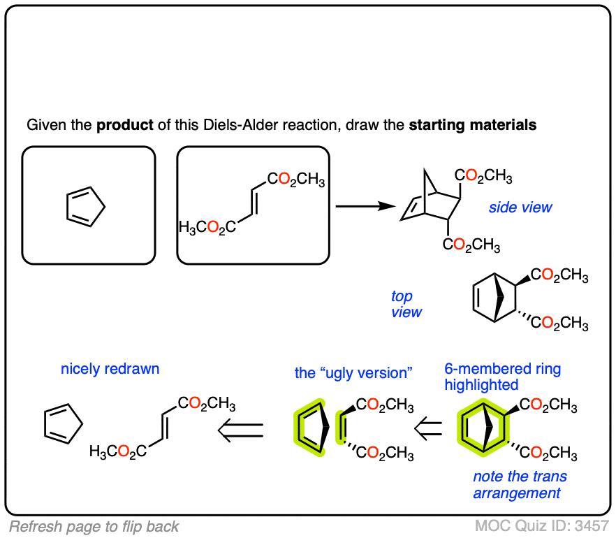 Note that we’ve drawn the product molecule [2.2.1] bicyclo-2-heptene from a “birds’ eye view” , i.e. from above. That’s the simplest way to do it. The trouble is that it doesn’t really convey the stereochemistry of the product.