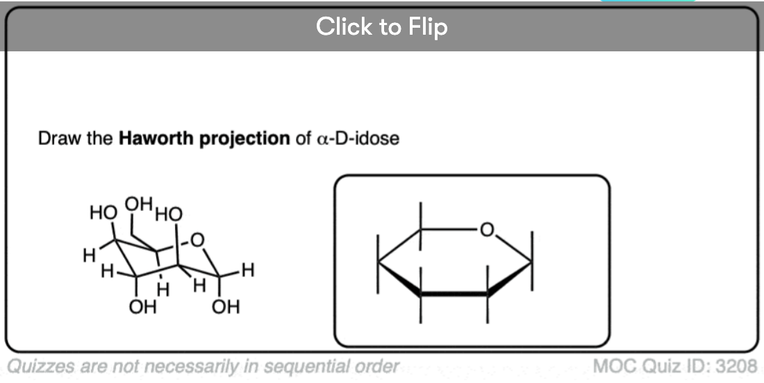 Note 2. What one might call the “classic” Haworth for a pyranose employs a full hexagon with equally spaced sides and the front three C-C bonds in bold. The Haworth used in this post is based on a template in Chemdraw that elongates the horizontal lines and bolds the three frontal C-C bonds. Either is acceptable.