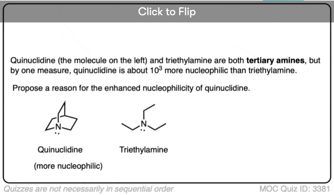 A particularly interesting example of a highly nucleophilic tertiary amine is quinuclidine, where the three alkyl groups are “tied back” in a bicyclic structure. The nucleophilicity paramter of quninuclidine in acetonitrile is 20.5, on par with the azide ion.