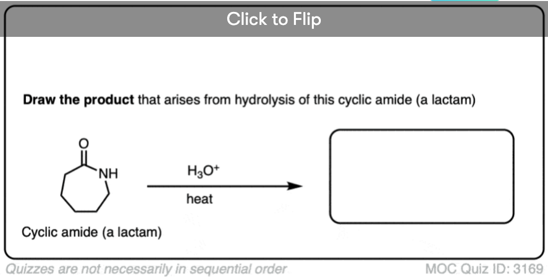 Make sure you can draw the product for the hydrolysis of a cyclic amide (lactam) since reactions of cyclic molecules (and their reverse, intramolecular reactions) are common fodder for exams.