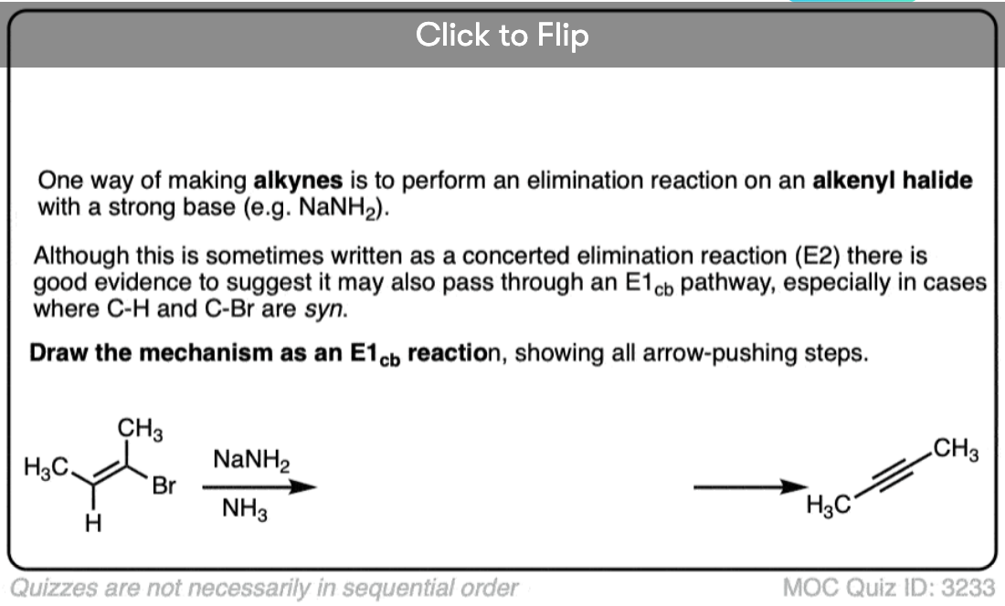Another example of the E1cB is in the formation of alkynes from alkenyl halides with NaNH2 in liquid ammonia (NH3). [See: Alkynes via Elimination Reactions]