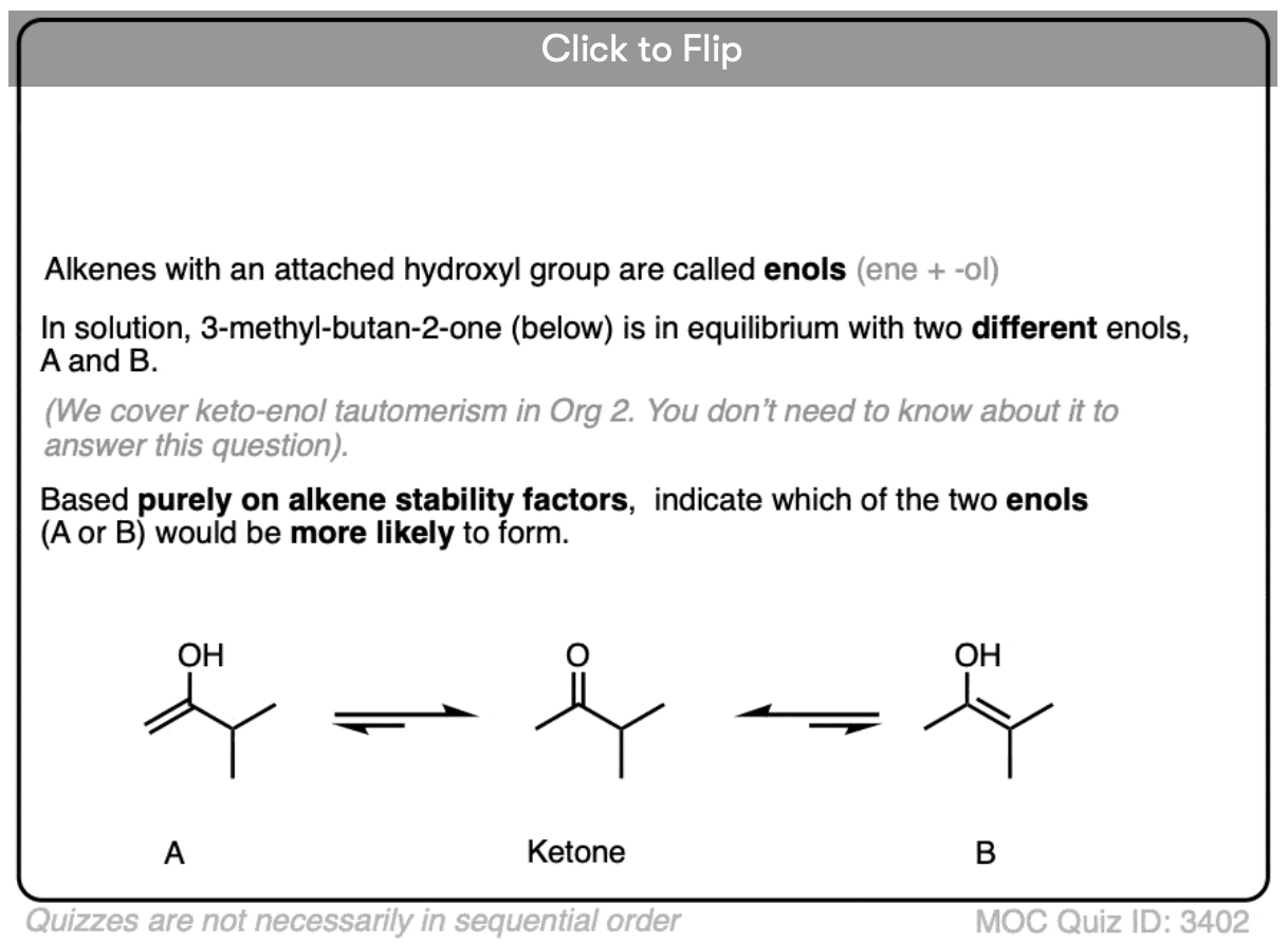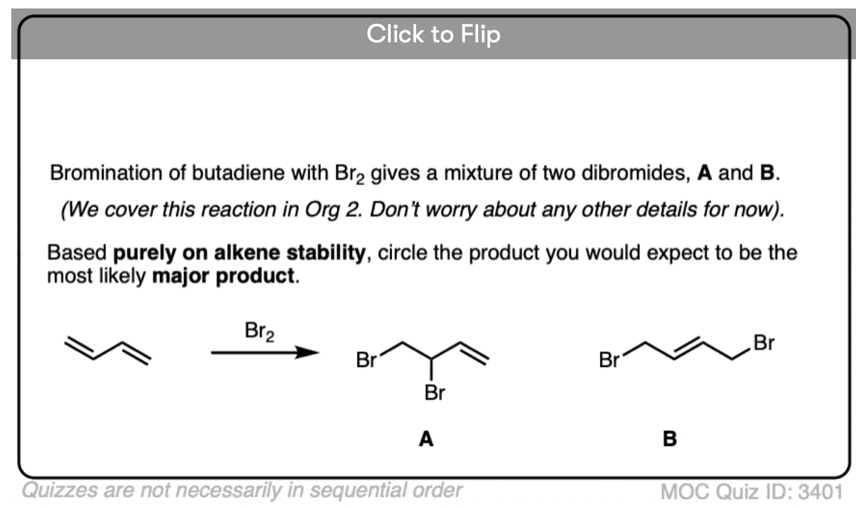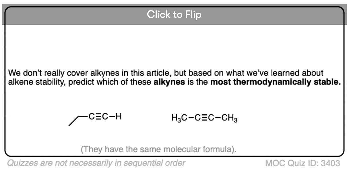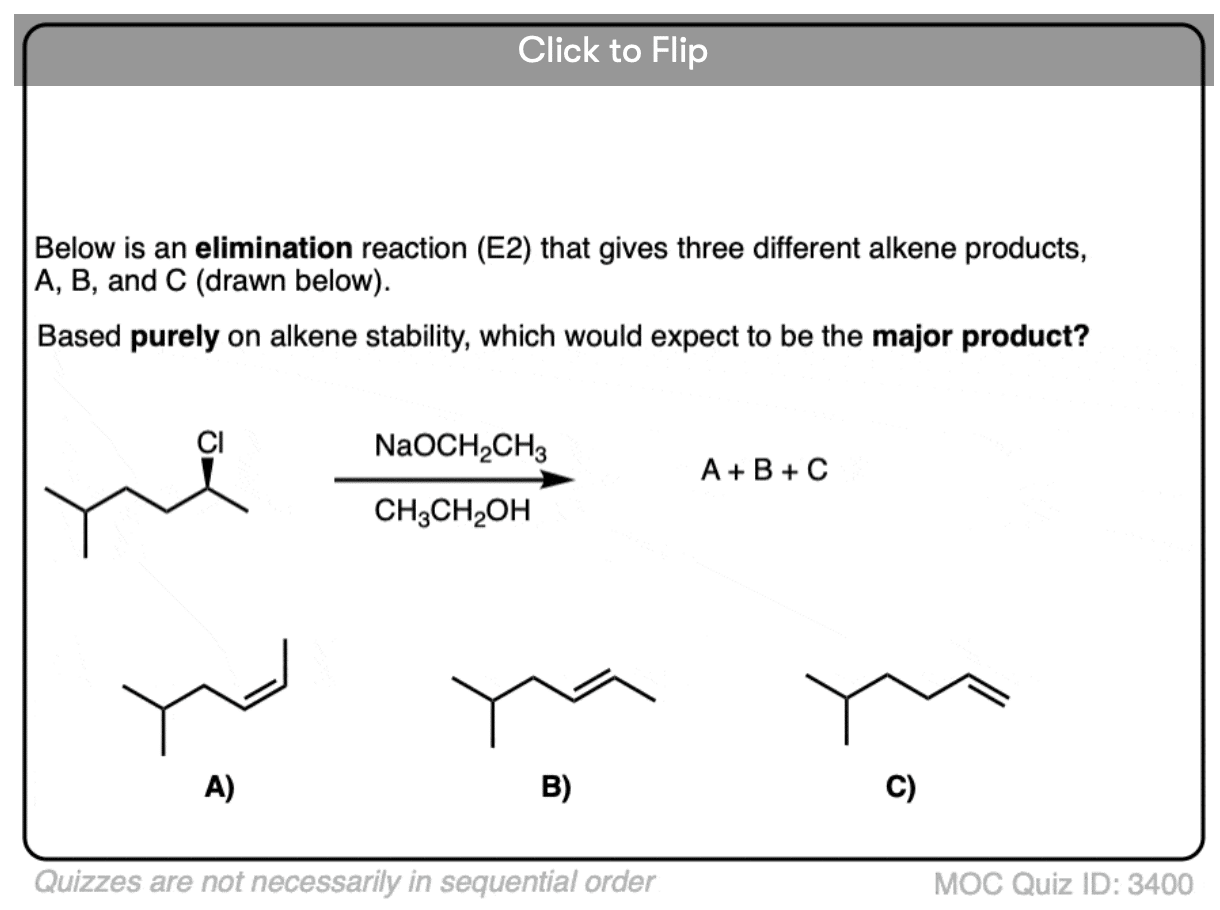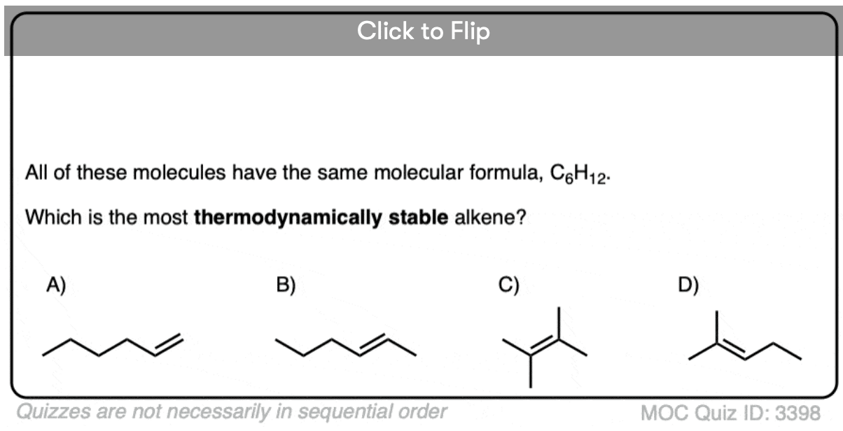 The increasing stability of alkenes with increasing substitution not only comes up in Zaitsev’s Rule, but also later in the course when you study Thermodynamic and Kinetic Control.