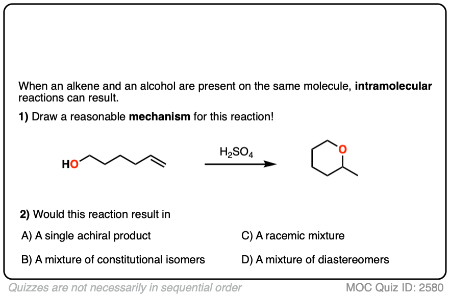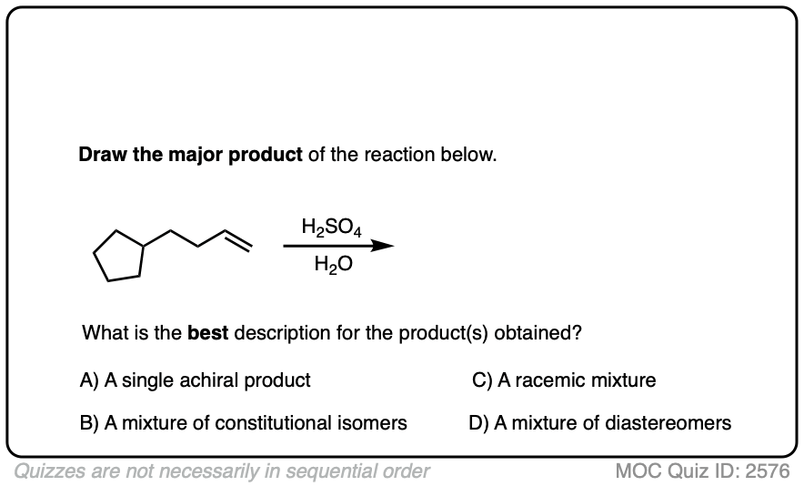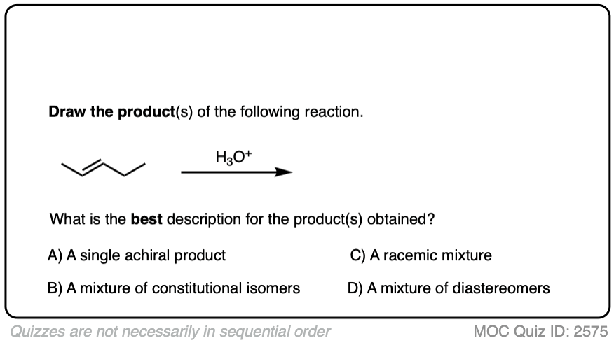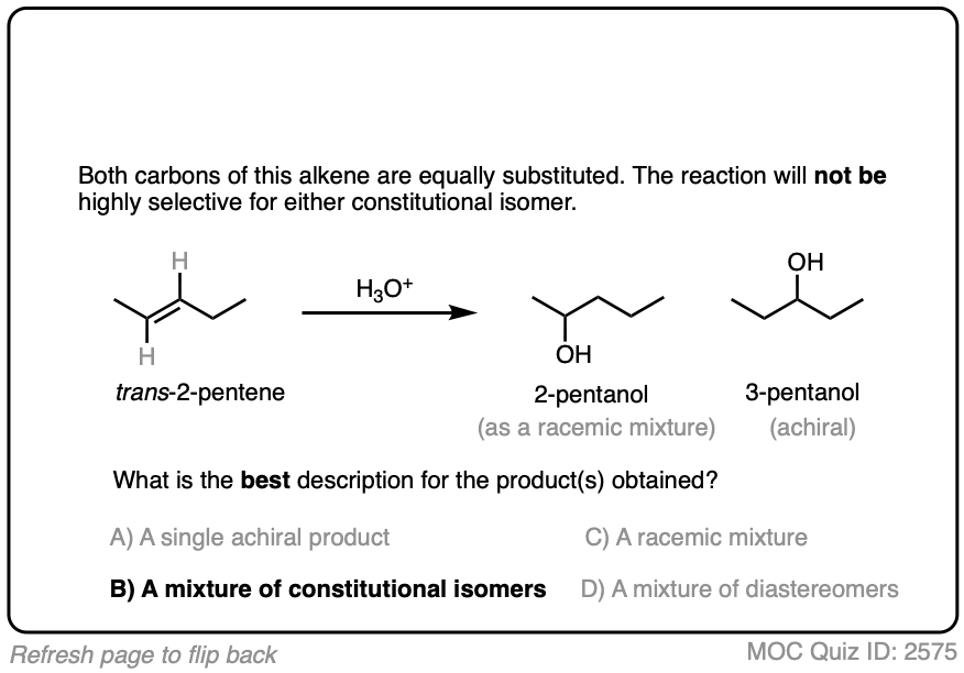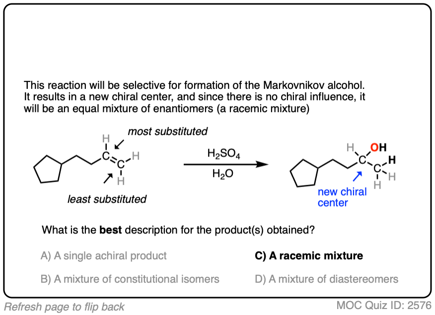 Depending on the structure of the starting alkene, the resulting product(s) may be a mixture of structural isomers, a mixture of enantiomers, diastereromers, or a single achiral product. [For more on this topic, see What’s A Racemic Mixture, or Types of Isomers]