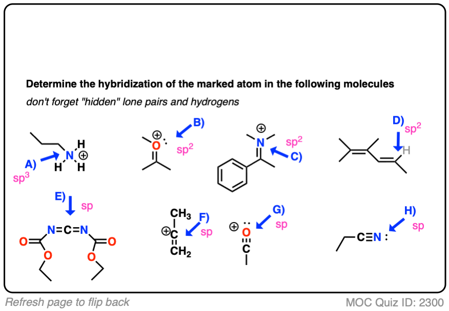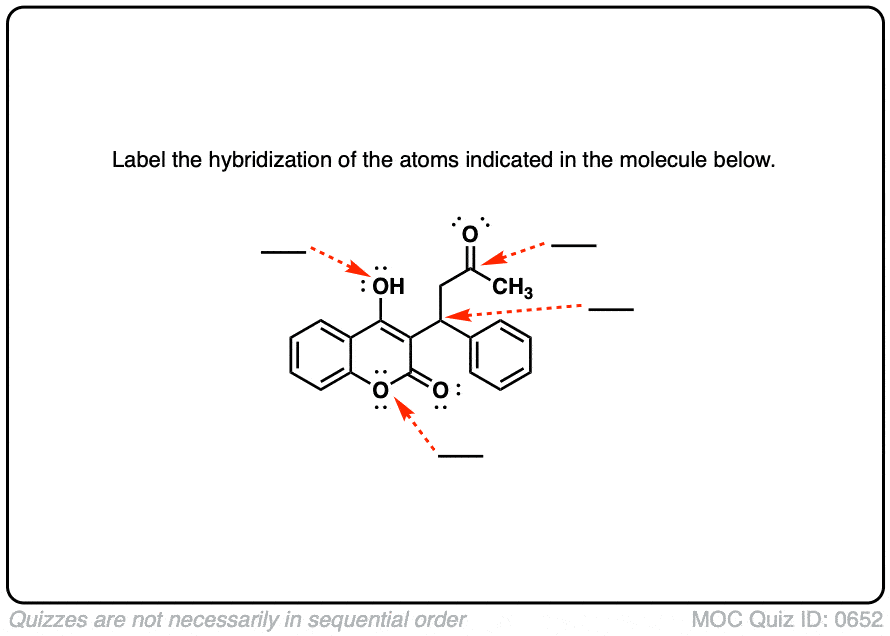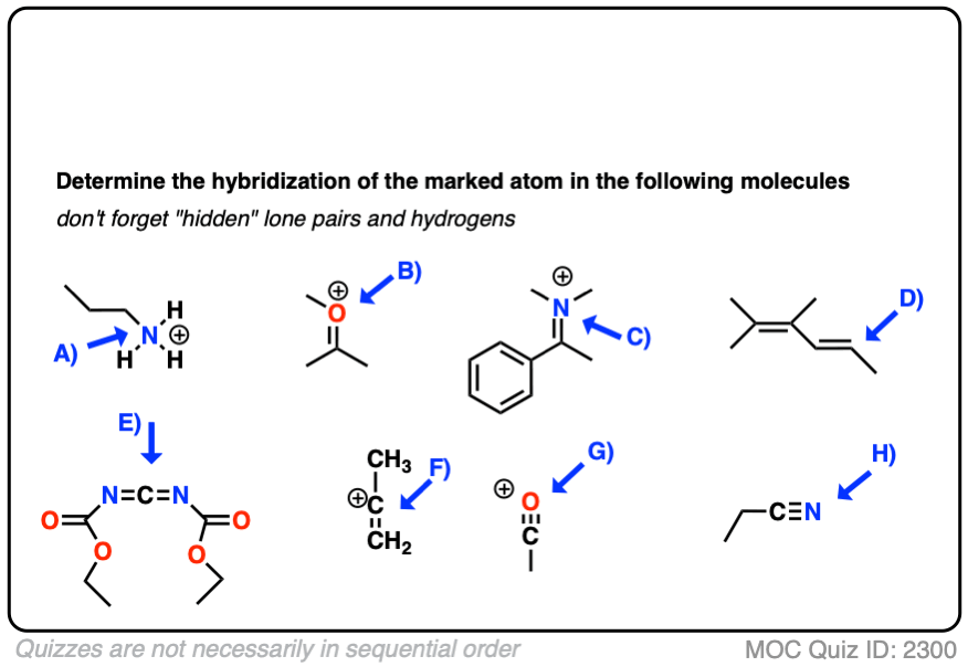Expect to be able to determine the hybridization at pretty much any atom. One form this commonly takes is to be shown a large molecule and your job is to assign hybridization at various atoms. Remember the hybridization shortcut, which involves counting the number of attached (atoms + lone pairs).