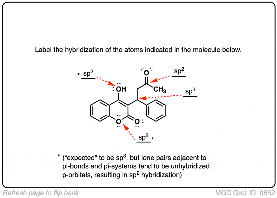 • If 2, it’s sp. (If it’s 1, it’s probably hydrogen.)  Just be on the lookout for atoms with lone pairs adjacent to pi bonds.