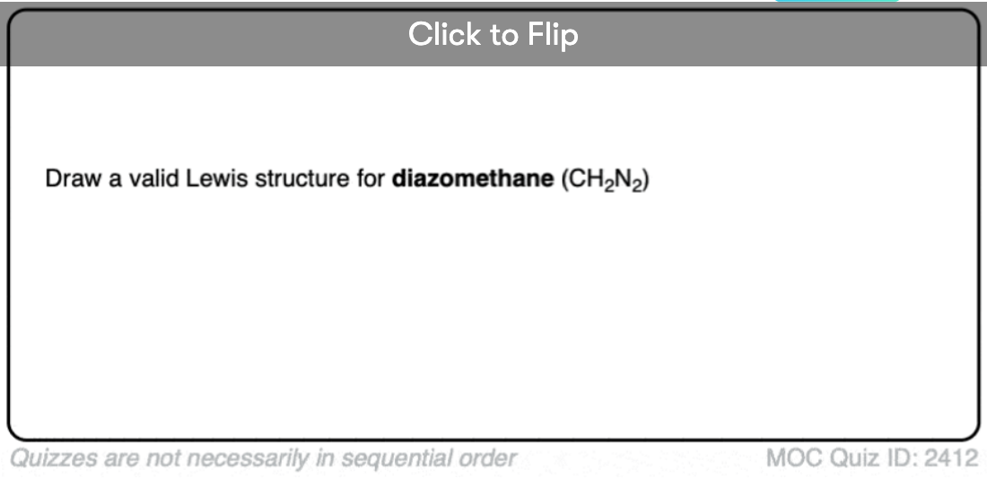 Expect to be able to draw a Lewis structure for simple molecules. Popular examples include diazomethane (CH2N2), nitromethane (CH3NO2), the carbonate ion (CO3)2- and others. Here are a few examples: